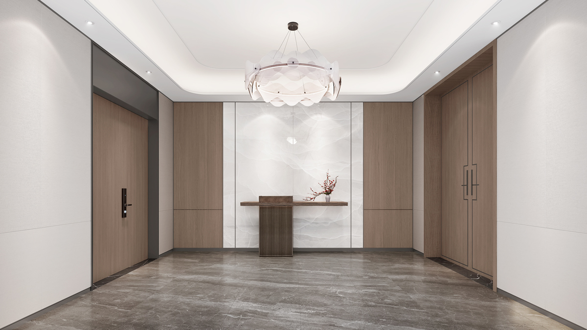 上图是进门小厅设计,顶面造型石膏板设计具有时尚设计感;端景墙面木饰面与山水画墙布质感鲜明。