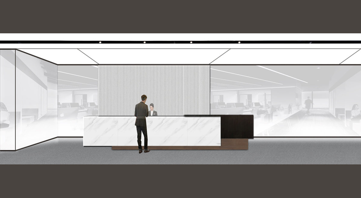 前台设计相对简单,形象墙采用浅色饰面板,简洁,大方。爵士白大理石与黑胡桃饰面板拼接成的吧台,黑白相间更加体现企业稳重之感。