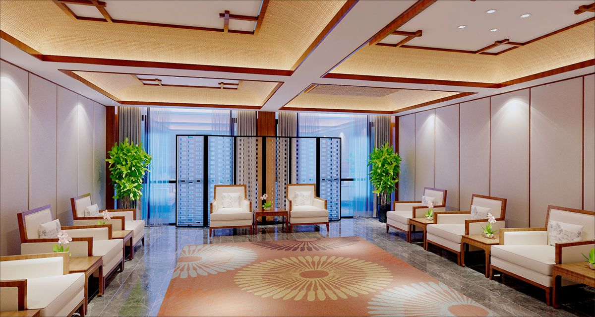 会议室:石膏板吊顶走边,暗藏LED淡黄色灯带,顶面实木线条做造型,整铺装饰竹席,墙面米色真石漆。整个色调简洁、明快。合适的色彩和装饰元素可以增强会议室的氛围和舒适性。