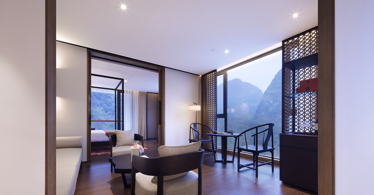 流水潺湲,峰林秀美,花海绵延无尽的阳朔就如同一幅虚实难分的写意山水,给人以无限的遐想与眷恋。陈砖瓦砾、石板长街,是岁月对夏棠的馈赠,千年古桥之下遇龙河湍流而过。本案的整体设计结合了历史与文化元素,寄情于景,返璞归真。