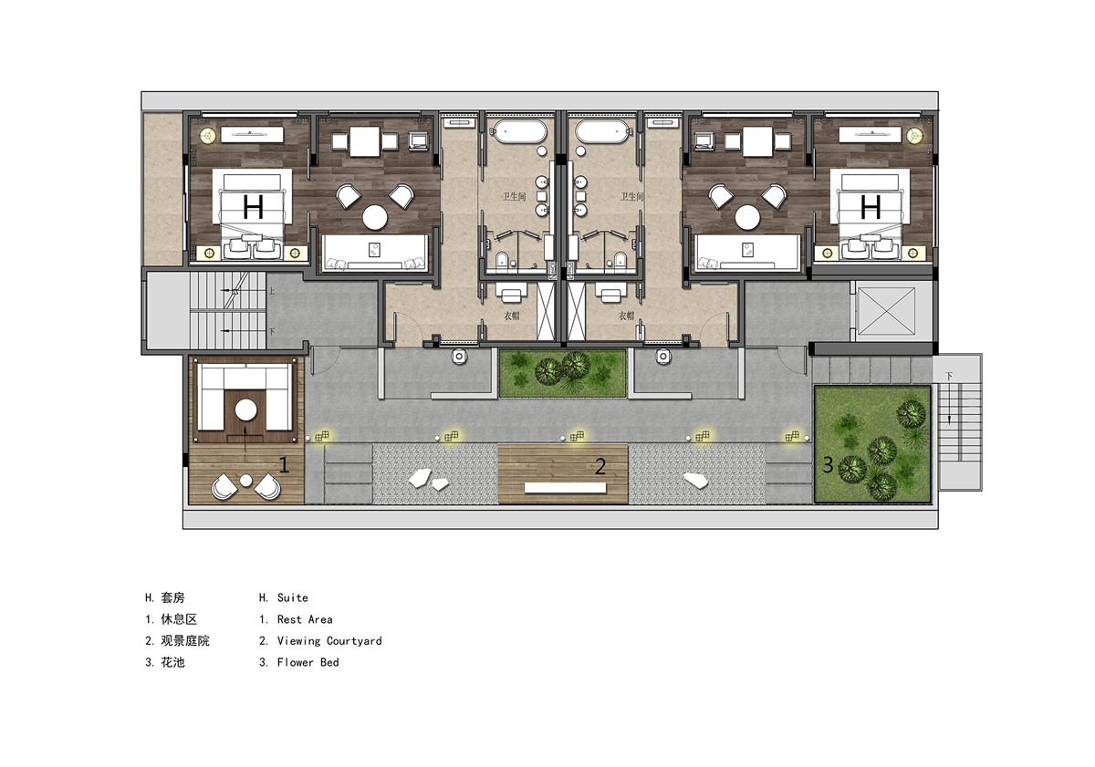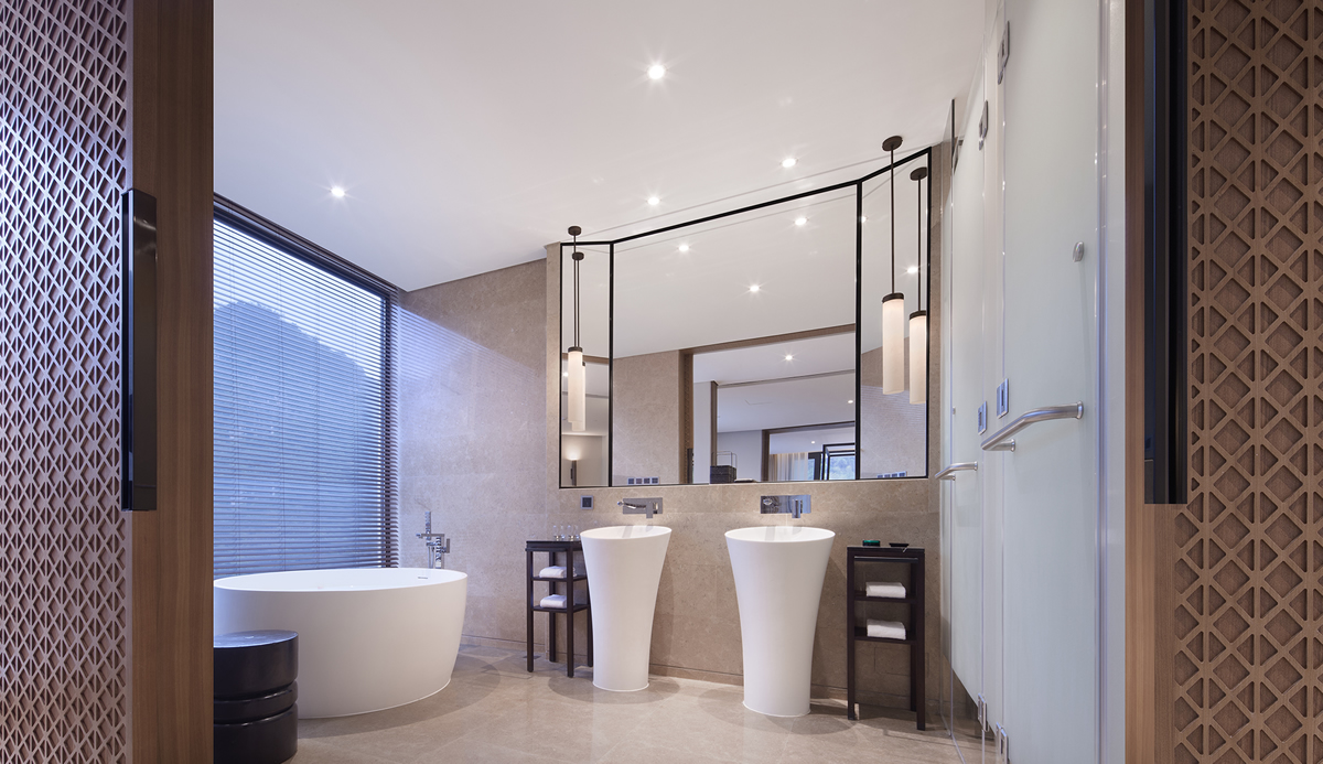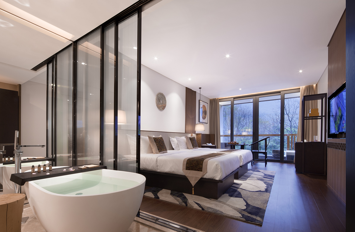 本案共有二十六间客房,根据不同的朝向景观和面积进行合理的划分。设计师提取出具有代表性的地域色彩应用在客房区域,创造不同的情境体验,使空间更具自然的灵动与生机。大面积的落地窗将自然景观引入室内,临窗而立,将景致尽收眼底。客房沿用简洁、雅致的设计笔触,让当代的设计理念,结合有拙性的物件,形成视觉上的碰撞与冲突,以情寄物,以物传情,赋予空间灵魂。客房采用了智能化系统,配合温馨的氛围照明,意境之余,更多的是舒适。
