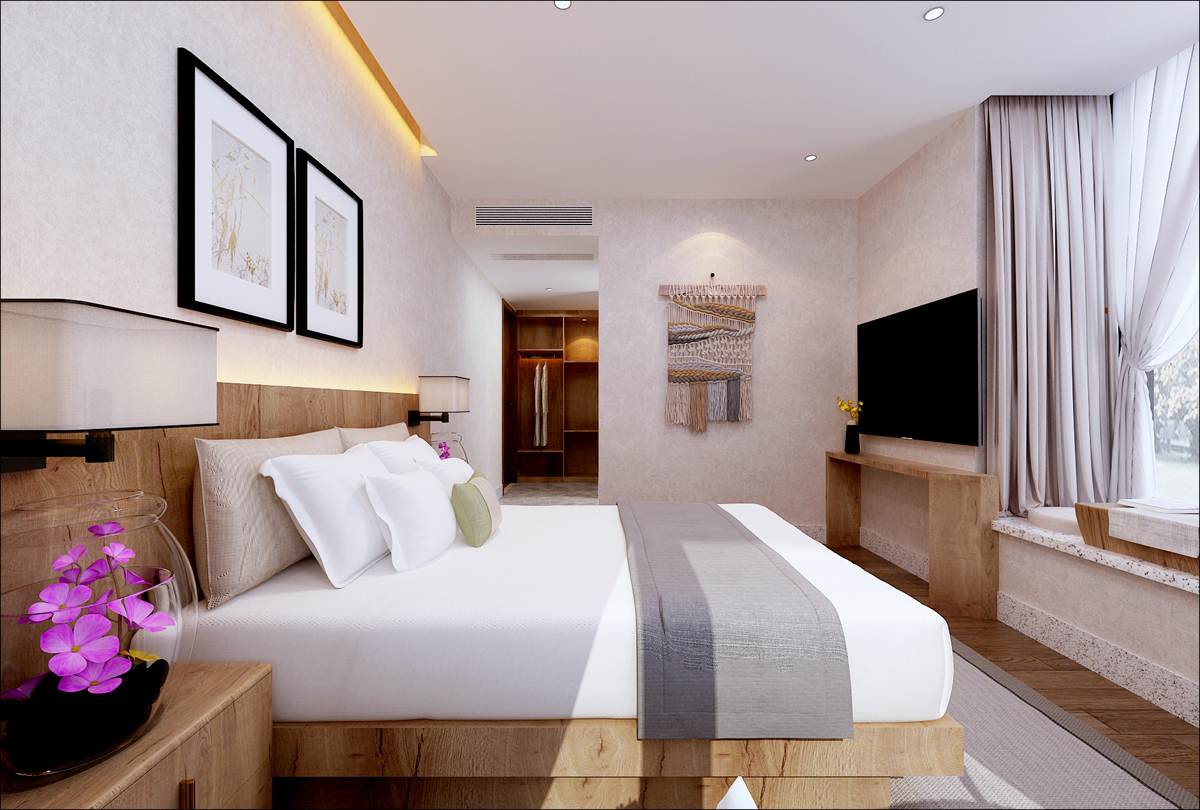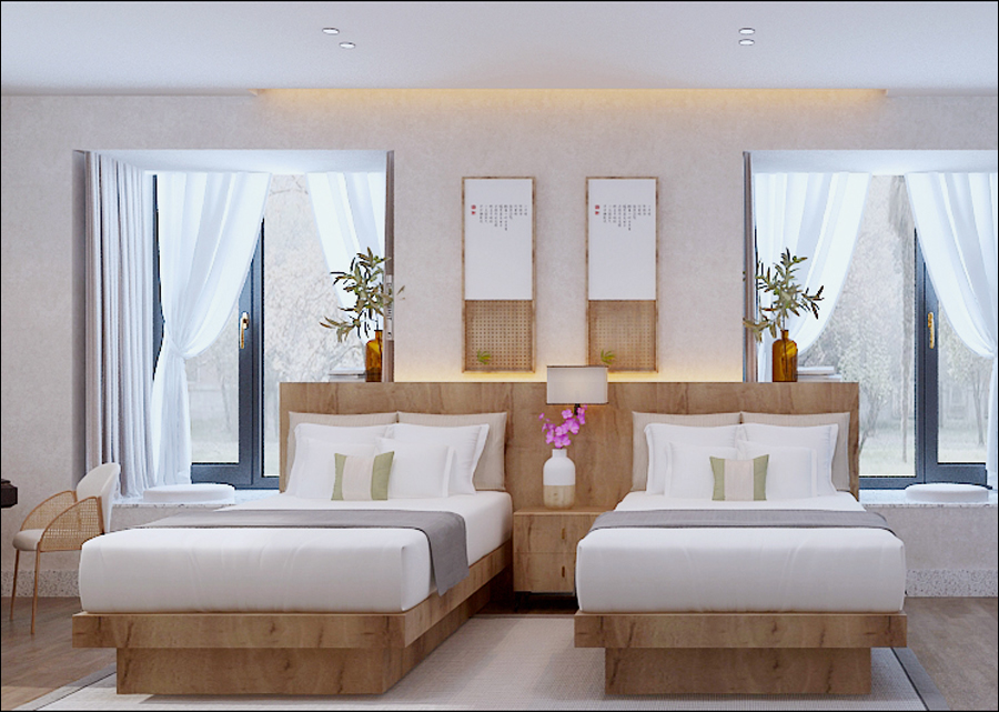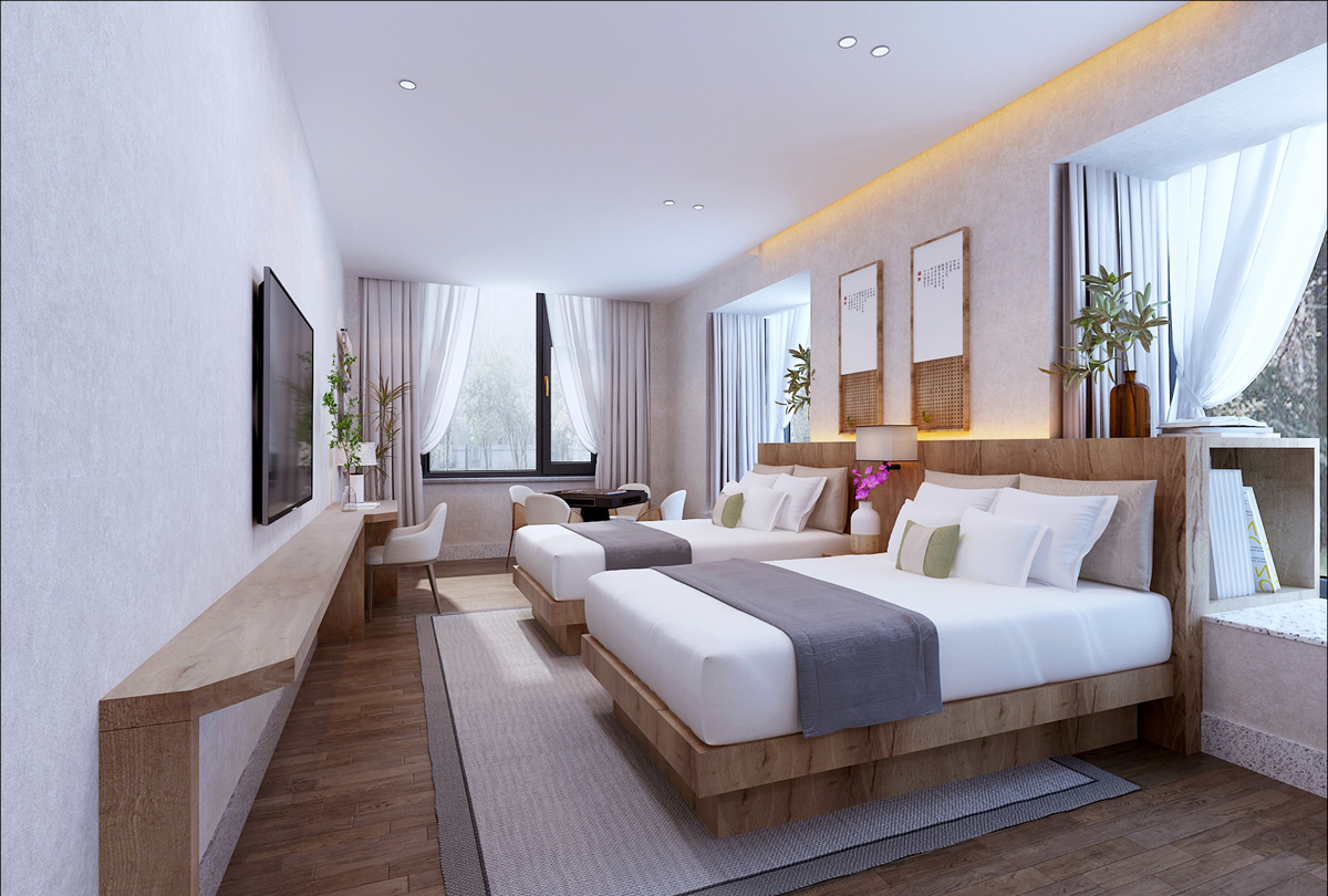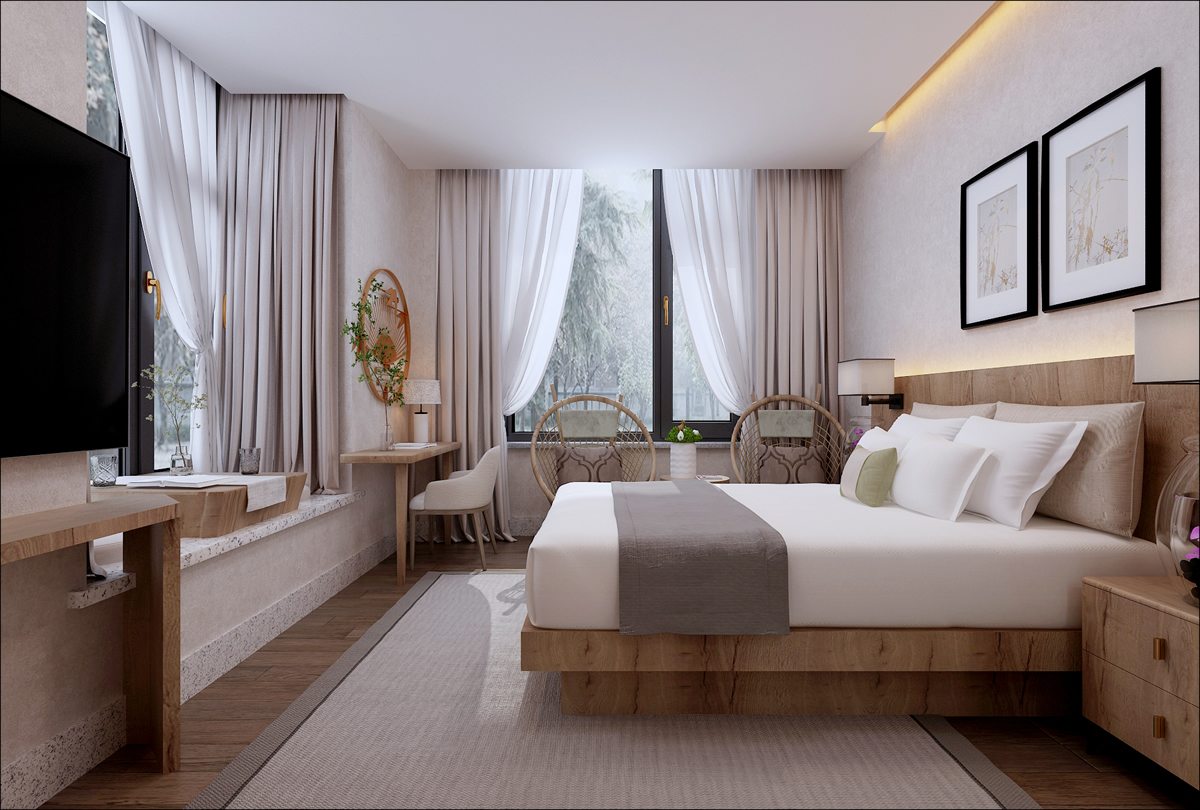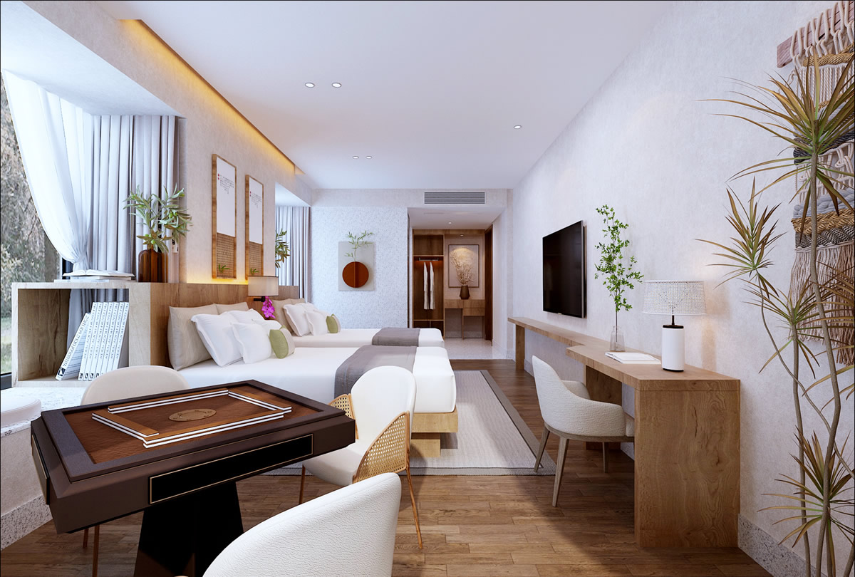 酒店共有二十间客房,根据不同的朝向景观和面积进行合理的划分。设计师提取出具有代表性的地域色彩应用在客房区域,创造不同的情境体验,使空间更具自然的灵动与生机。大面积的窗户将自然景观引入室内,临窗而立,将景致尽收眼底。客房沿用简洁、雅致的设计笔触,让当代的设计理念,结合有拙性的物件,形成视觉上的碰撞与冲突,以情寄物,以物传情,赋予空间灵魂。客房采用了智能化系统,配合温馨的氛围照明,意境之余,更多的是舒适。