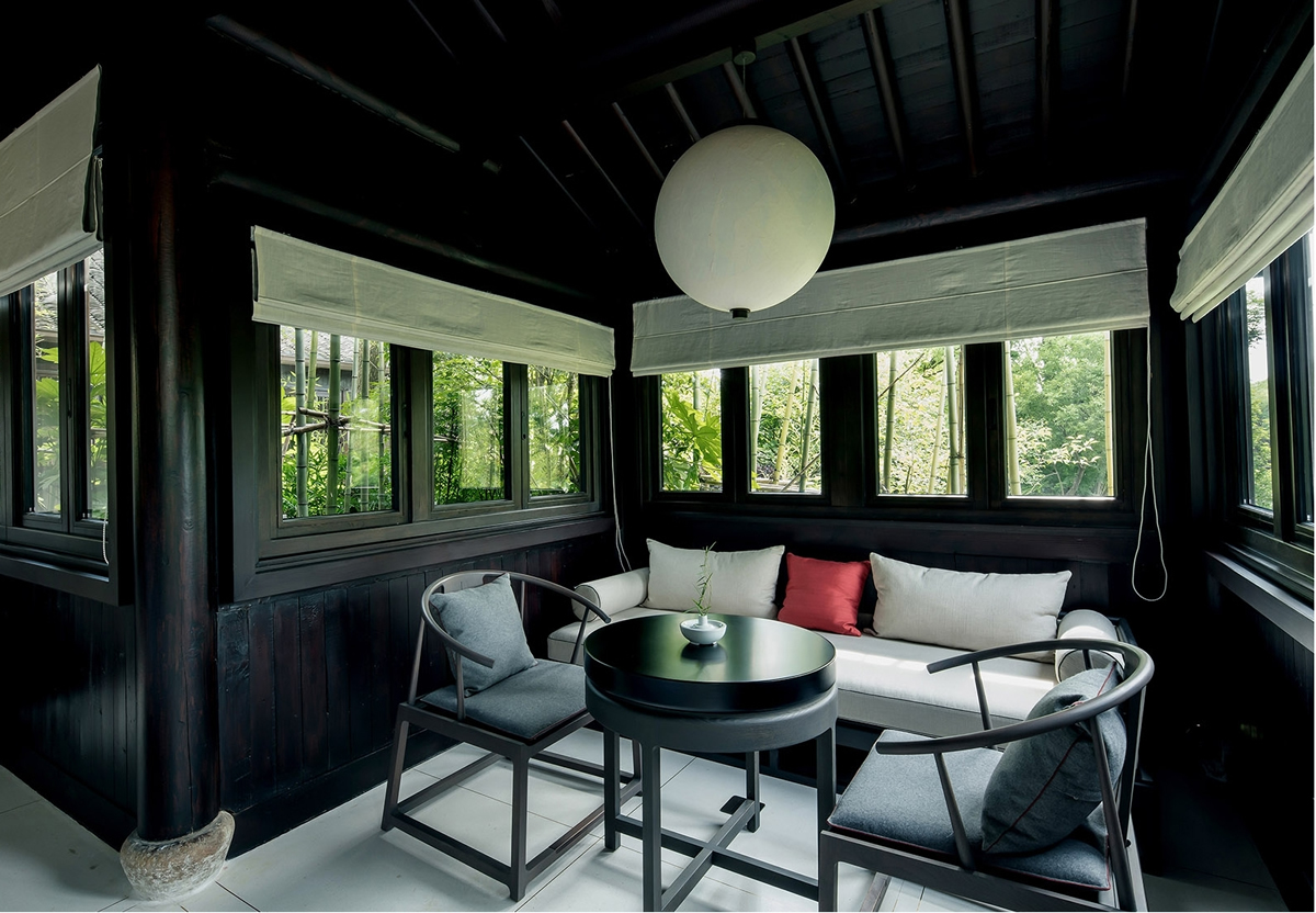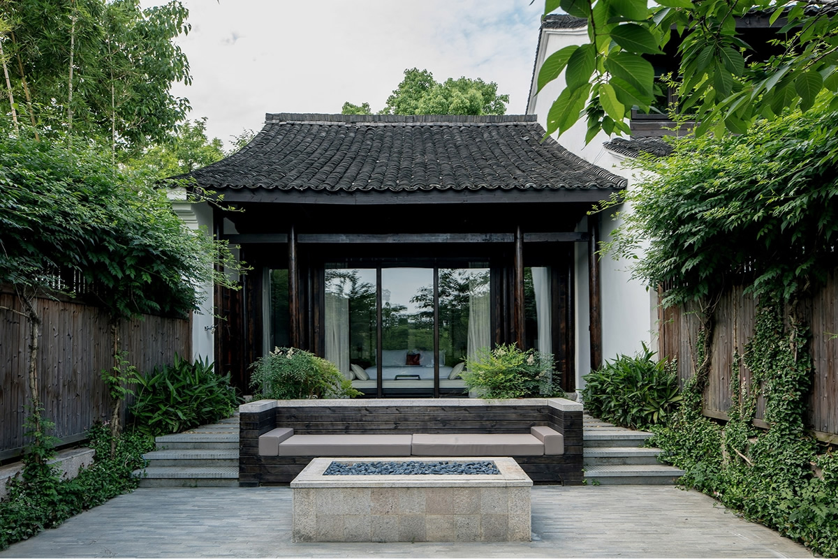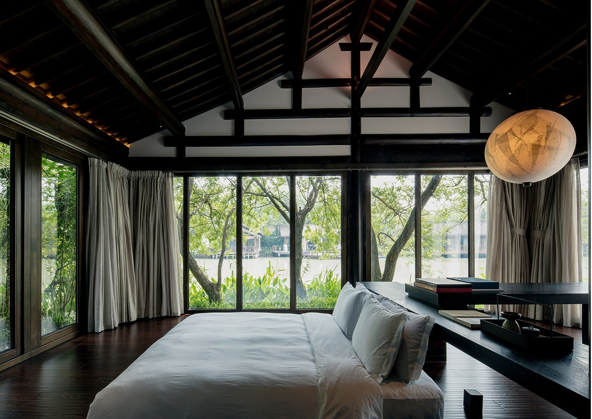 窗,成为重要的媒介。传统中式的建筑,注重隐、闭,惯以镂空的窗格采光。在张炜伦的设计视角中,当代的中式建筑,不应因循守旧,应当传递当代的居住精神,让天光水色,满盈室内,无处不在。她在设计中,以大面积开窗面打破了建筑的闭合感。框架结构与明朗玻璃窗,将室外的水云天,与室内闲逸之心,融为一体。户外露台、汤池的无边界设计,让歇息的居者与西溪静逸水域更为相融。室内空间的序列,不设实体隔断,仅透过装饰自然过渡。将床榻、卧具、浴池均面向风景,带来深度的沉浸体验。晨起、闲坐、品茗、沐浴…每一个瞬间,都在风景簇拥与环抱大景小景之间。沿用中式民居的白墙灰石,仿若水墨留白。庄子曰:虚室生白,吉祥止止。这样纯净无求的状态,恰恰是度假心态的写照。设计以虚白与素朴的材质色彩,留下足以回味的余韵。