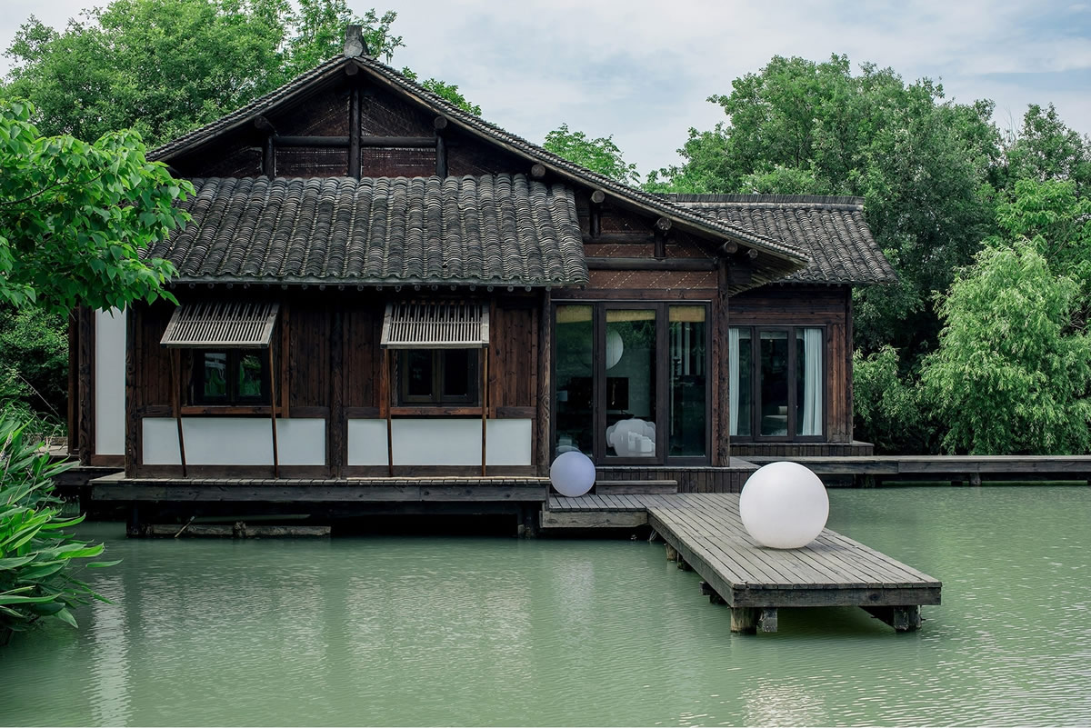民宿是在留存的江南民居基础上修复、拓建,尽力避免干扰原生地貌。20栋独立院落看似随意散落在野趣横生的广袤水域,使每一栋水上居所拥有开放观景视野的同时,又静享隐匿。每一栋院落各得其景,各不打扰。溪行、访庄、游园、枕水、沐溪、提香、孤往是度假民宿精心安排的体验之旅,蕴含书房、茶室、禅思、SPA等空间,处处体现东方生活美学。
