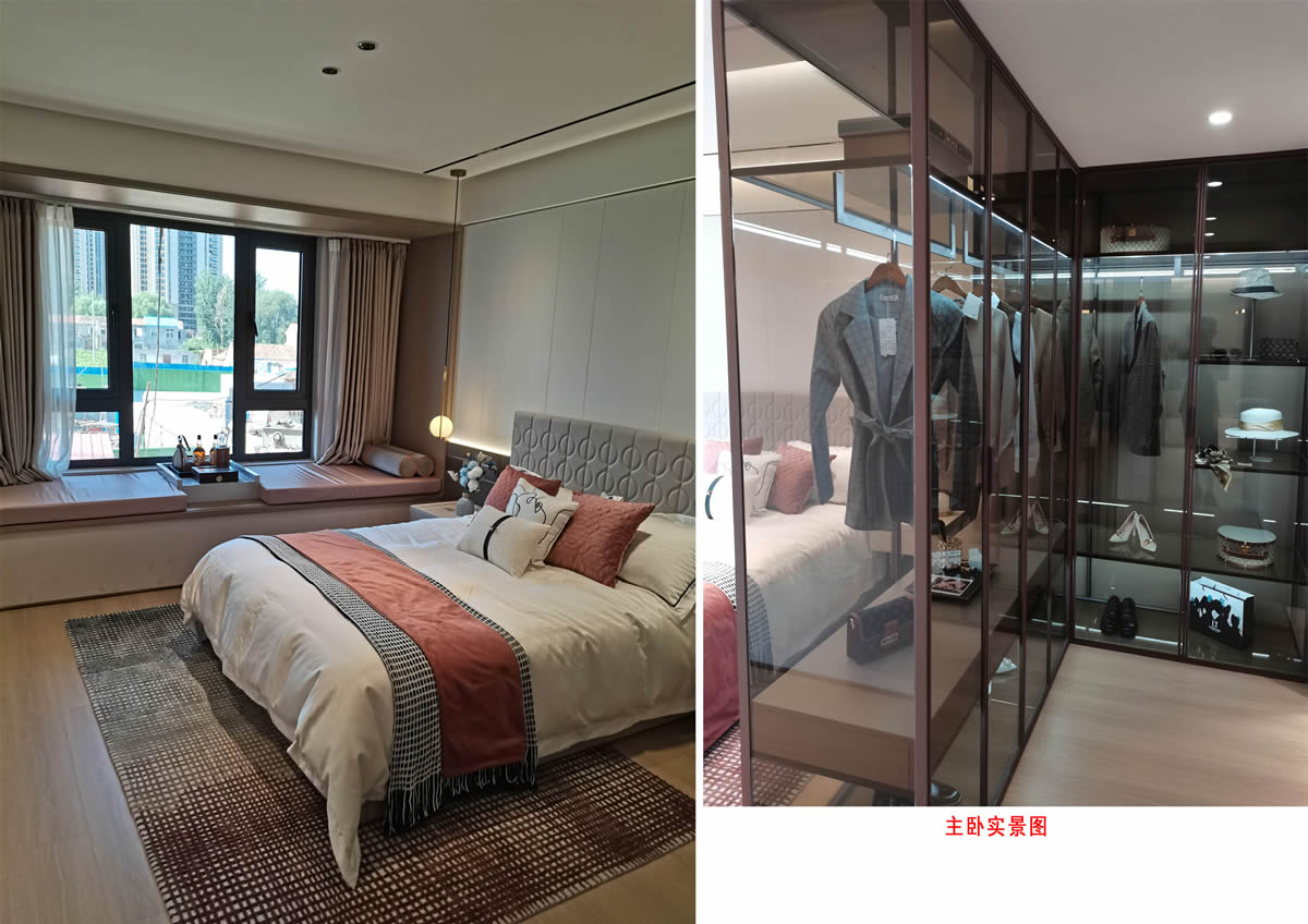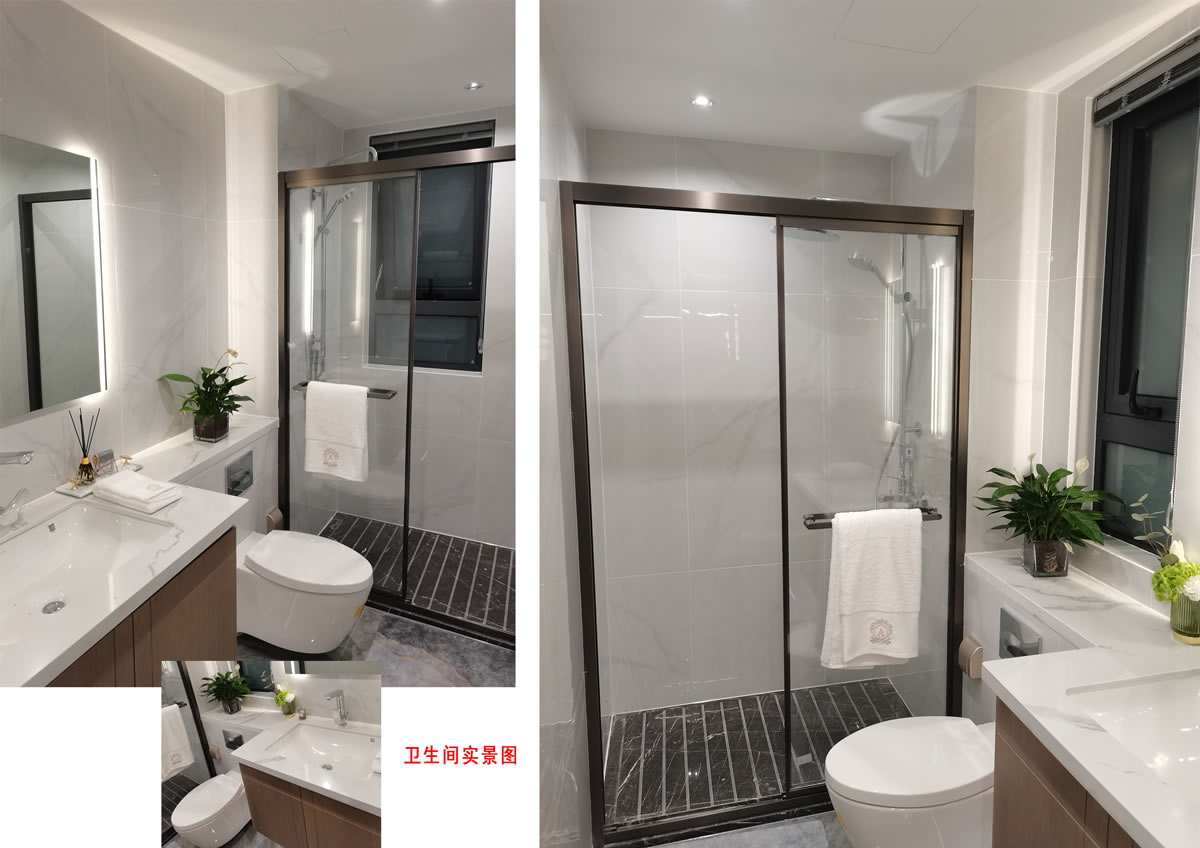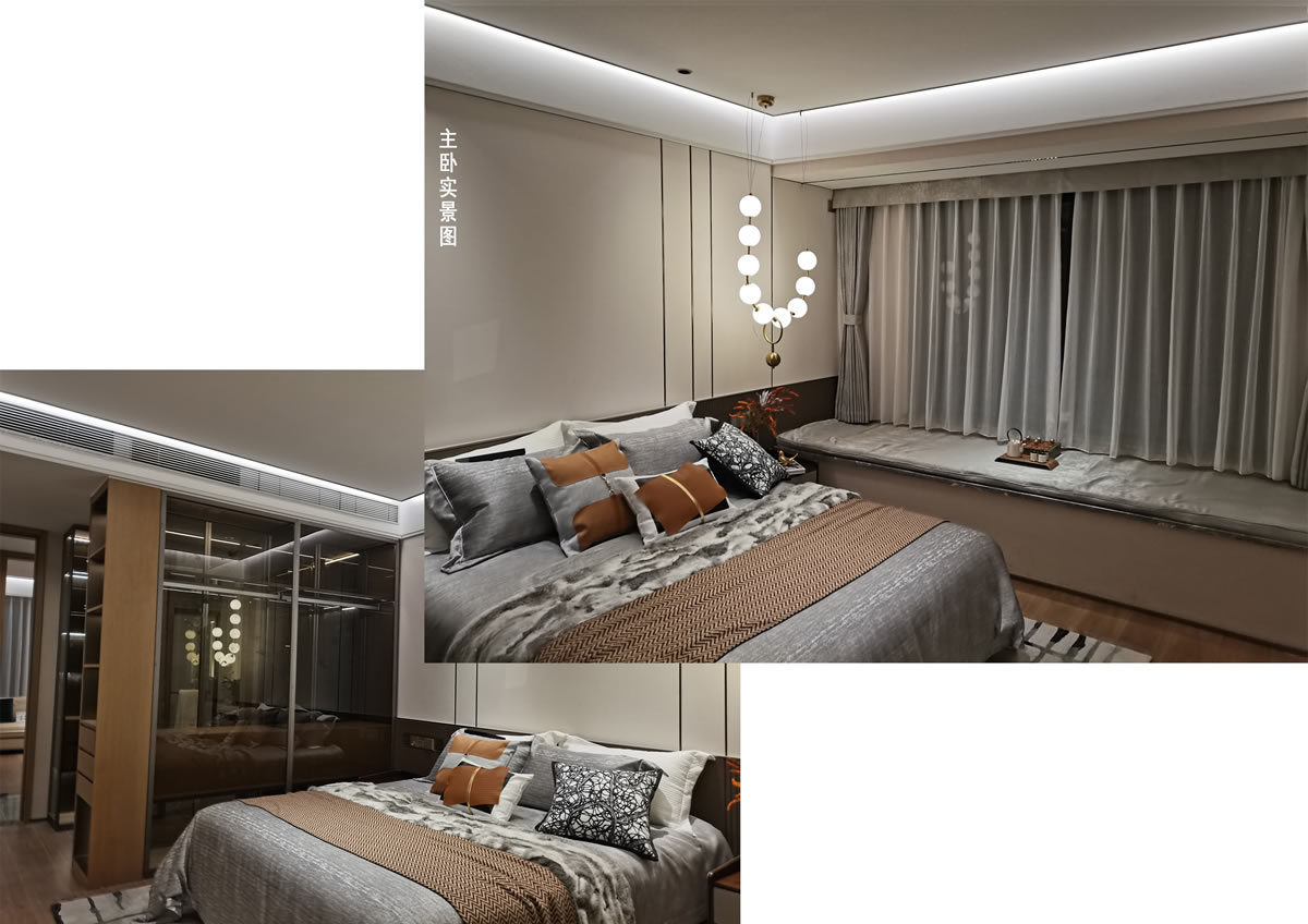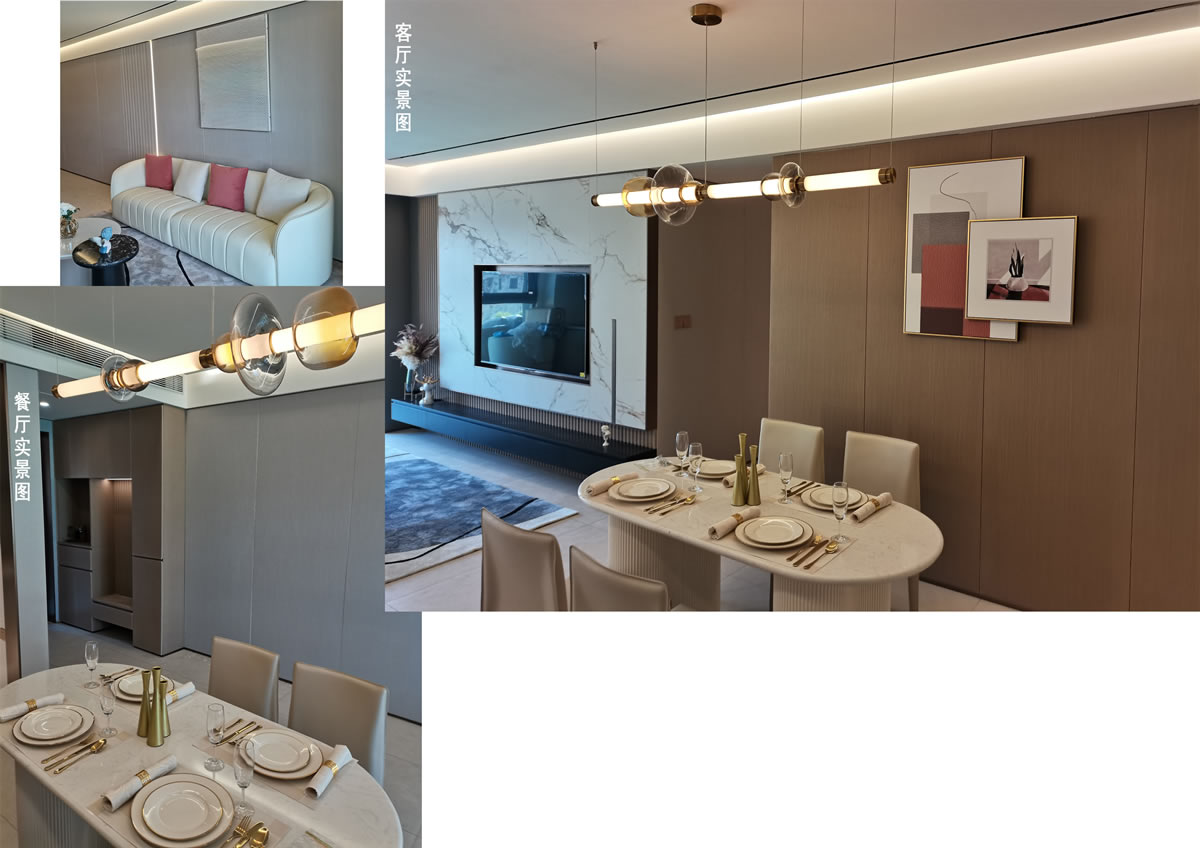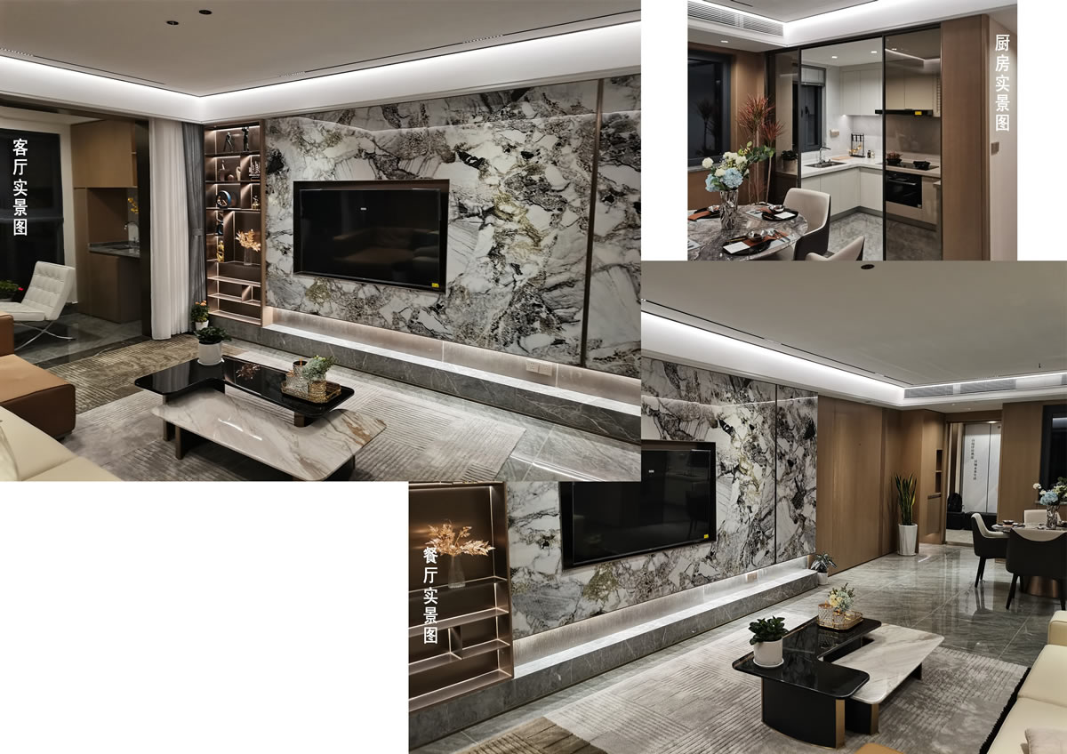 项目概况:本案位于淮北市濉溪县二里庄,样板间位于11号楼201与202室,规划为客厅、餐厅、厨房、次卧、休闲阳台 、外卫、书房、主卧、主卫等功能布局。主要装饰材料如下:客餐厅、过道、房间为纸面石膏板吊顶,白色涂料饰面;卫生间、厨房防水纸面石膏板吊顶,防水白色涂料饰面。客餐厅、过道墙面木工板基层,木饰面及布艺硬包饰面加不锈钢造型线条装饰;客厅电视背景钢架及木工板基础,冷翡翠岩板饰面及不锈钢展示柜装饰;地面800地砖满铺。厨房、卫生间墙面600*1200瓷砖满铺;地面、墙角防水满刷,600*600地砖通缝铺贴,淋浴区金镶玉大理石地面拉槽。房间及书房背景木工板基层,皮质硬包饰面加不锈钢造型线条装饰,其余墙面为墙布饰面;地面为实木多层地板铺设,极窄铜压条收口。