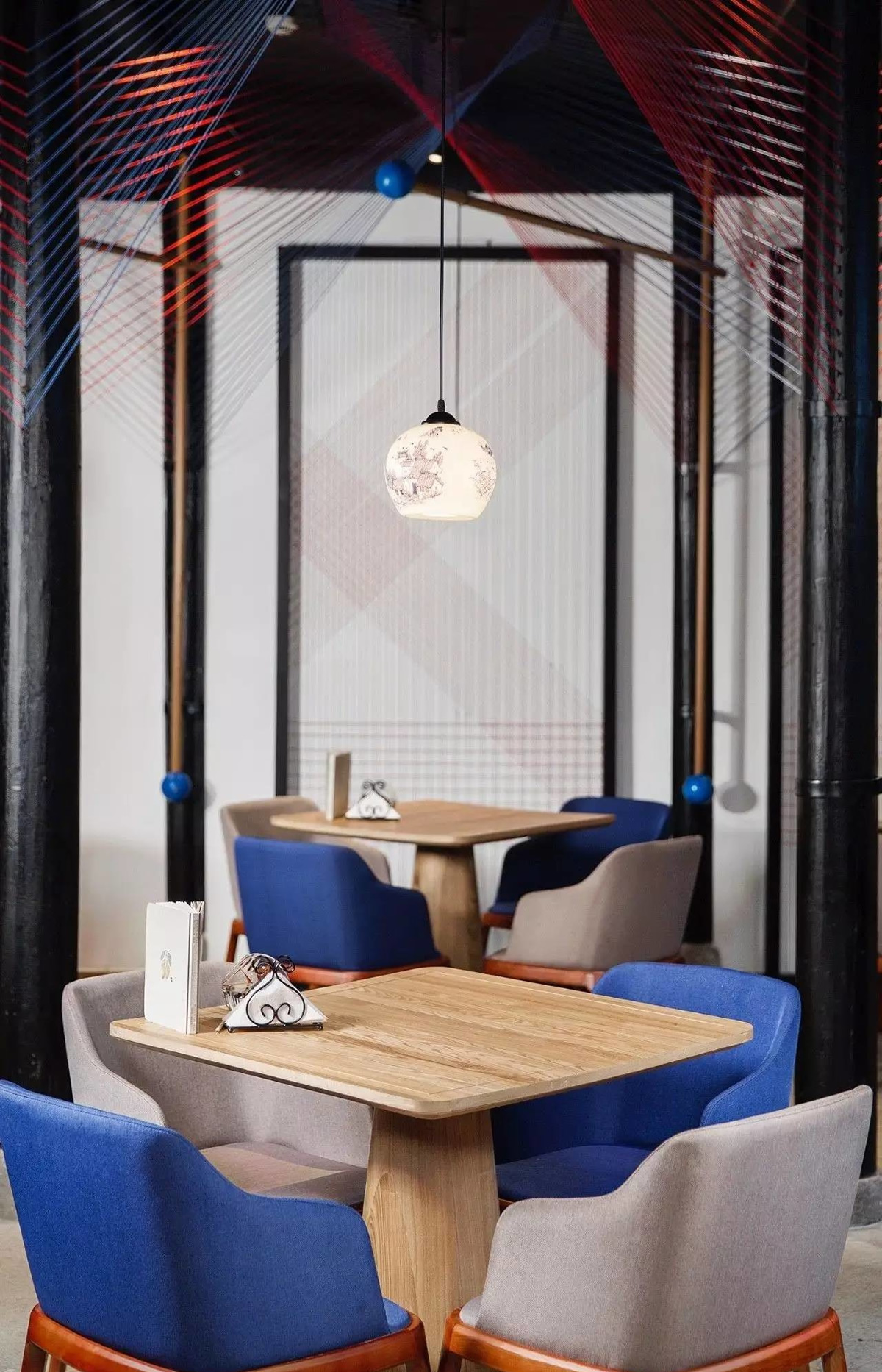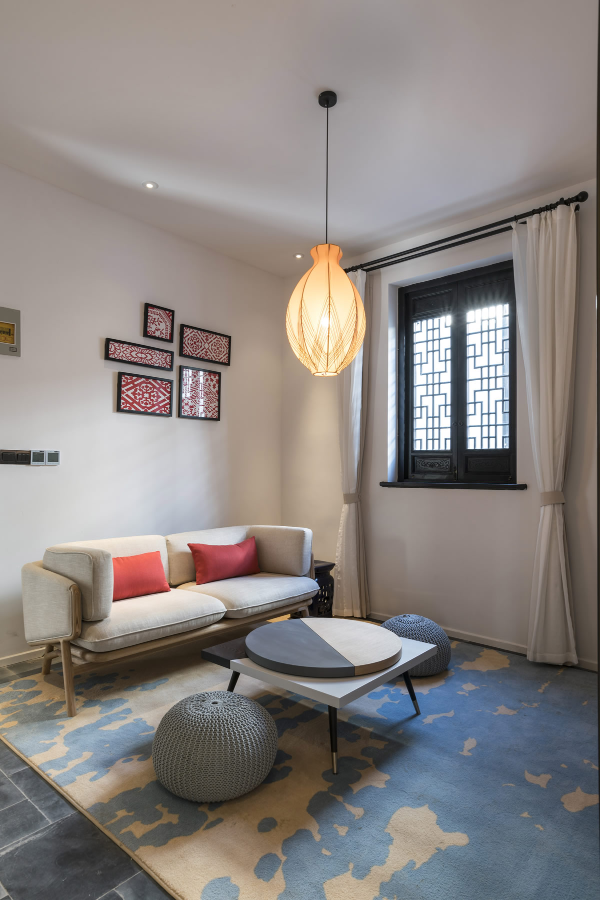 窗格是新中式风格中使用频率最高的装饰元素,空间隔断、墙面硬装均可选择使用。另外还可以将窗格元素进行再设计,如将在半透明玻璃上做出窗格图案的磨砂雕花;以不锈钢、香槟金等金属色做出窗格装饰等,都是十分常见的做法。