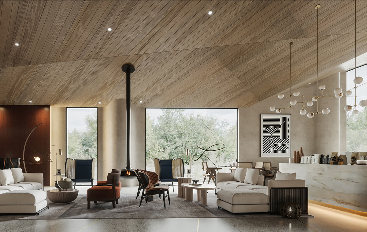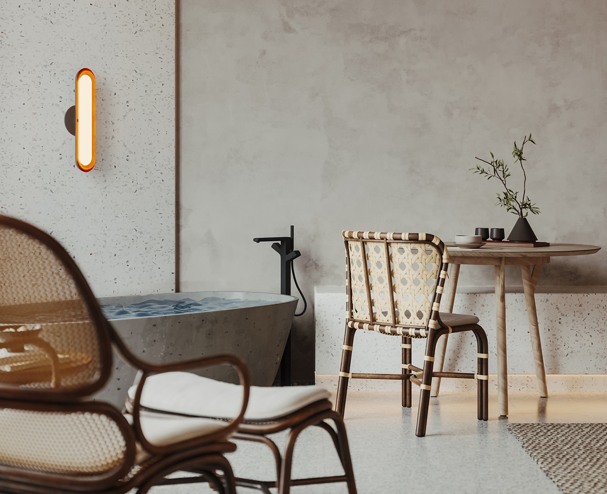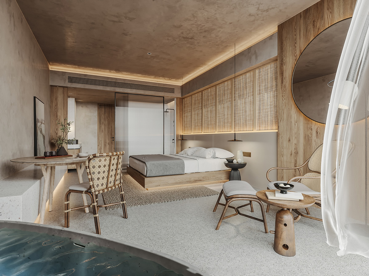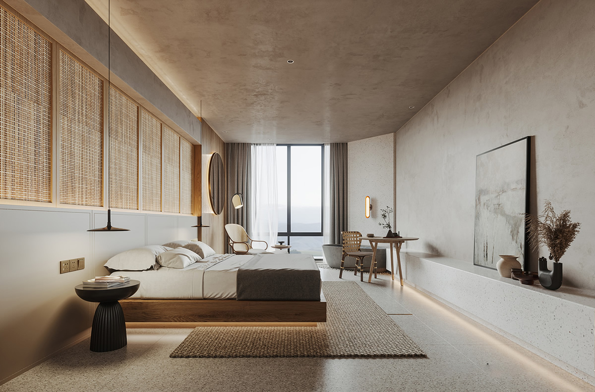 民宿呈现自然松弛的慢生活调性,让入住的客人暂时摆脱日常工作的疲惫和单调,在这里感受久违的质朴自然的田园生活,所以在材质的选择上多以亲自然、可持续性为主,比如水泥漆、老木料、天然藤编、麻布等等,作为室内墙面、梁架、顶棚的材料。