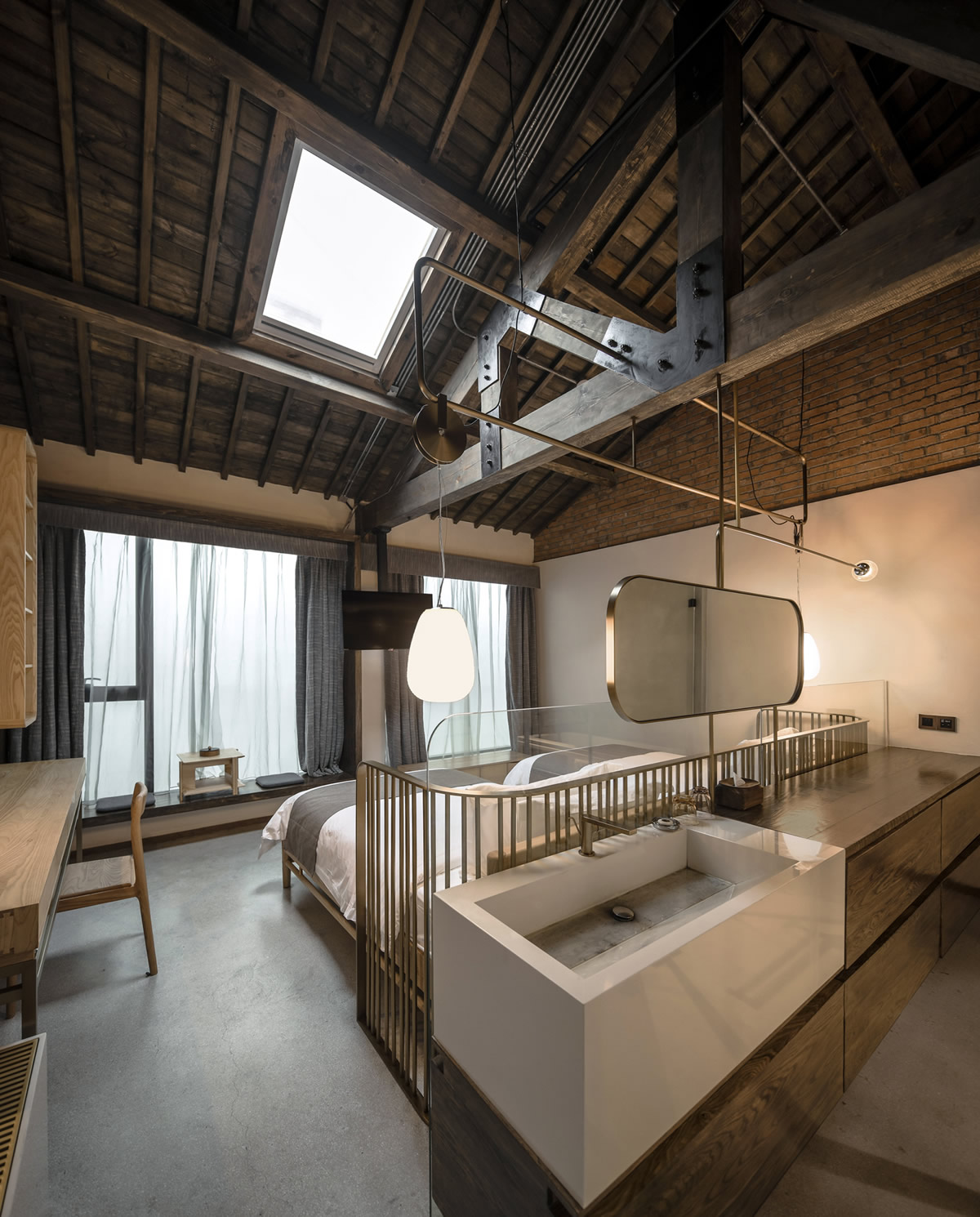 ※民宿客房在朝南的主楼,楼内空间功能分区布局巧妙,恰到好处。中庭,将楼道空间与露台以及后院全部打通,达到视线与空间的最大程度的开放。玻璃天窗保证了客房公共区域的采光需求,一改老旧房屋的昏暗,铜质和实木相结合的楼梯承上启下。阳光照进天窗,辗转映射在二楼白墙,透过挑空的中庭玻璃栈道照射到一楼水磨石地面,整个空间一气呵成,显得更加充沛明亮。