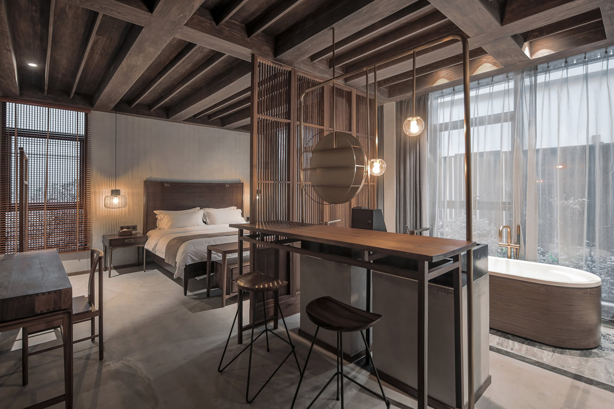 ※在新中式风格民宿改造设计过程中,采用简化的手法来体现中国传统文化内涵,古代“镜”原以铜或铁铸,现代设计师喜欢采用未经过度加工的铜料与圆形镜面组合,要勾勒生活品质,一个足以。简约梳妆台遇见陶瓷大浴缸,木艺遇见铁艺,厚重的铜镜遇到琉璃玻璃窗,现代化设施遇到别出心裁的设计。