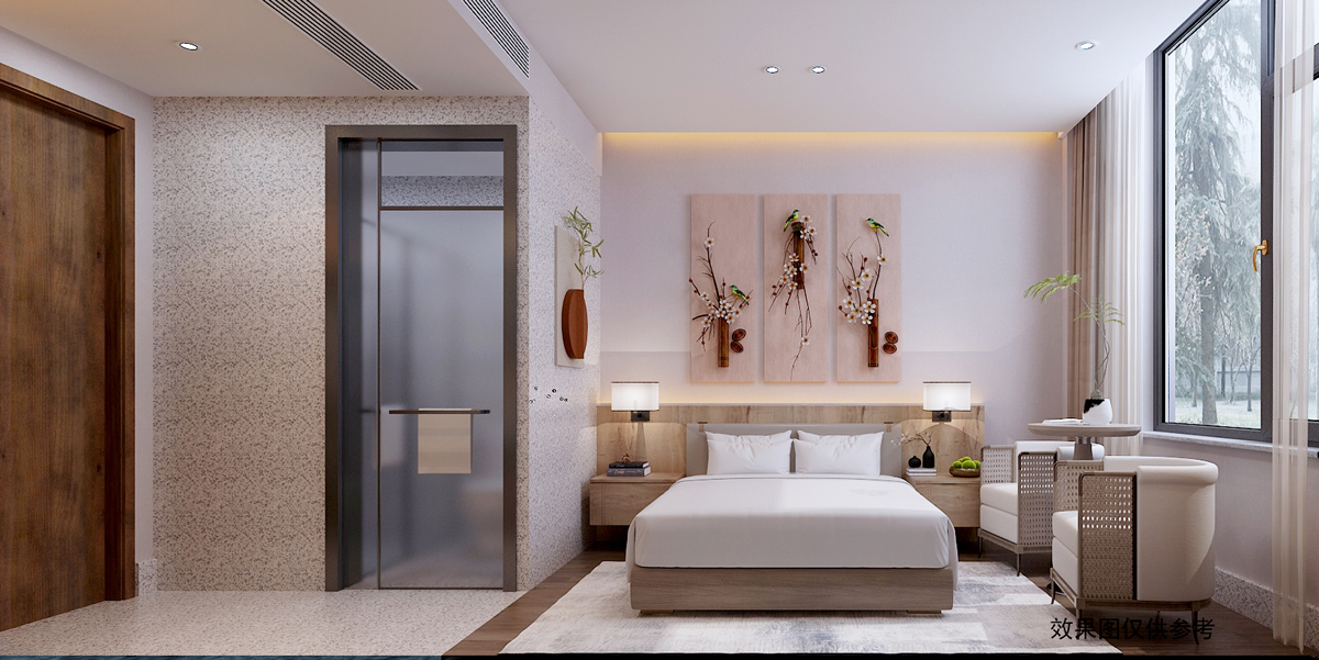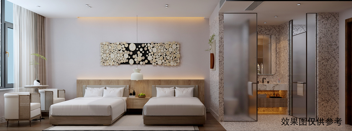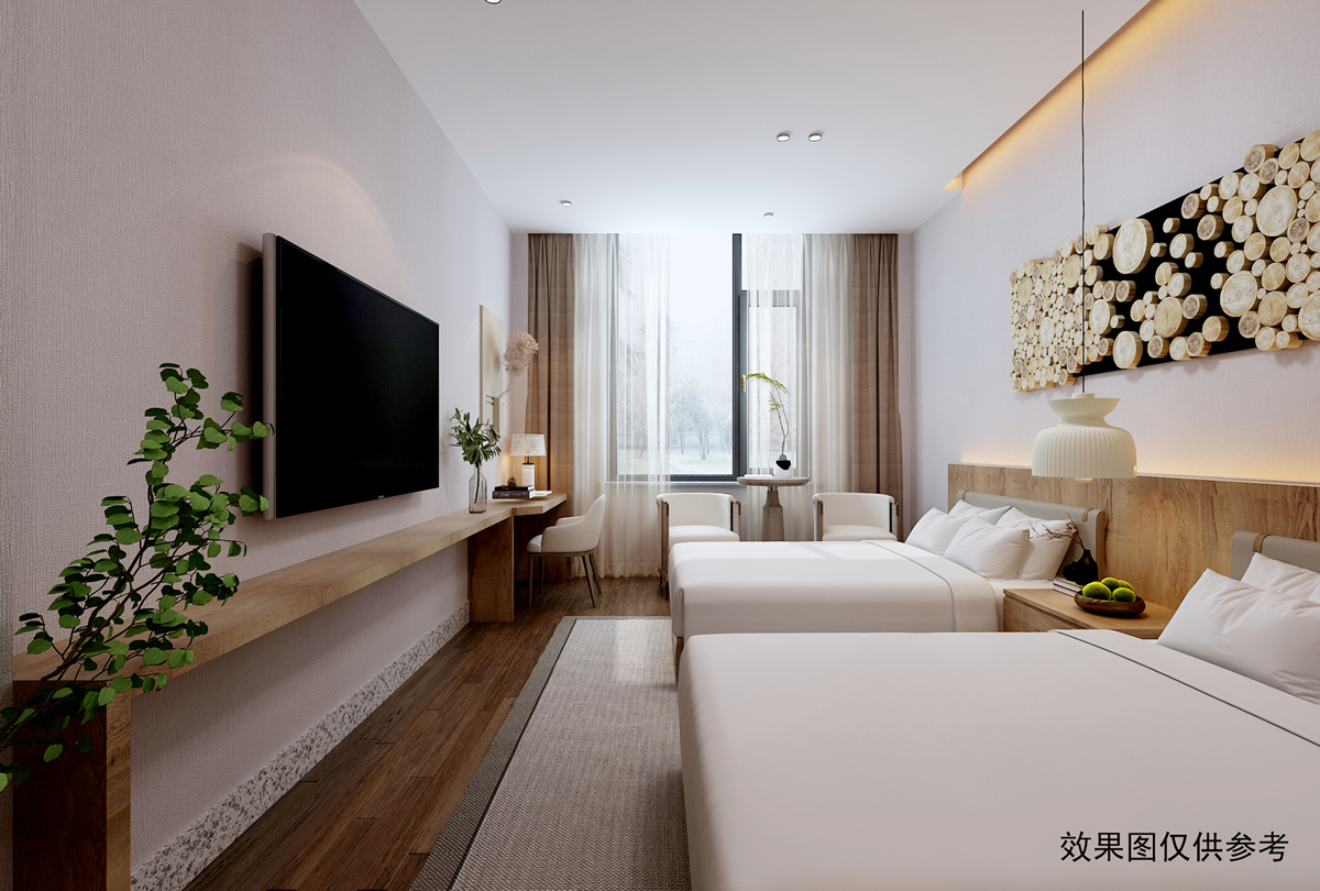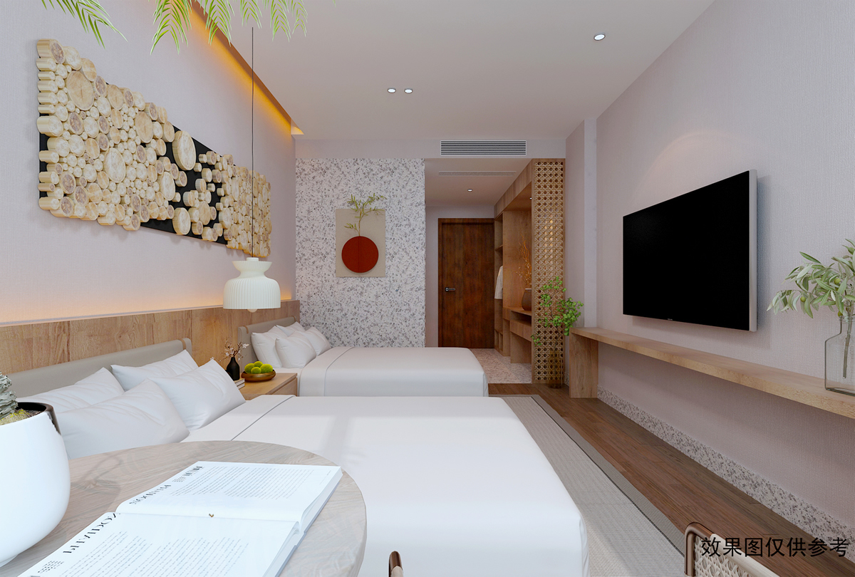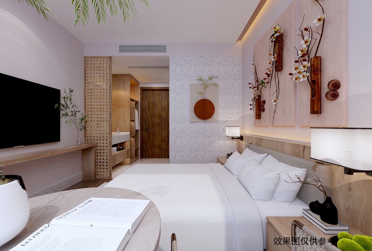 酒店共有三十间客房,根据不同的朝向景观和面积进行合理的划分。设计师提取出具有代表性的地域色彩应用在客房区域,创造不同的情境体验,使空间更具自然的灵动与生机。大面积的窗户将自然景观引入室内,临窗而立,将景致尽收眼底。客房沿用简洁、雅致的设计笔触,让当代的设计理念,结合有拙性的物件,形成视觉上的碰撞与冲突,以情寄物,以物传情,赋予空间灵魂。客房采用了智能化系统,配合温馨的氛围照明,意境之余,更多的是舒适。