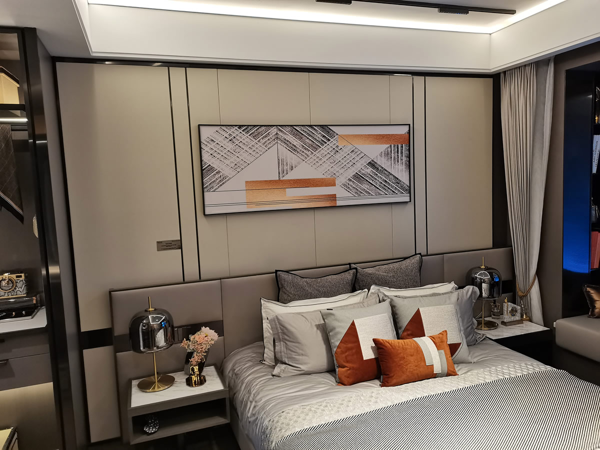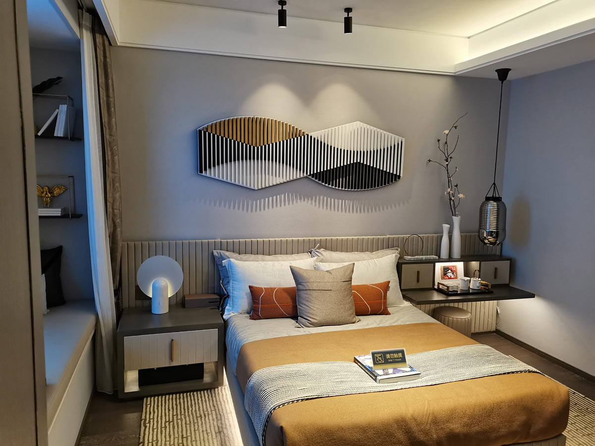 现代简约的特点是将设计元素、色彩、照明、原材料简化到最少的程度,但对色彩、材料的质感要求很高。因此,该实景空间设计简约、非常含蓄,却给我们十分大气的感觉!