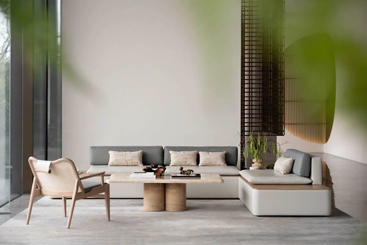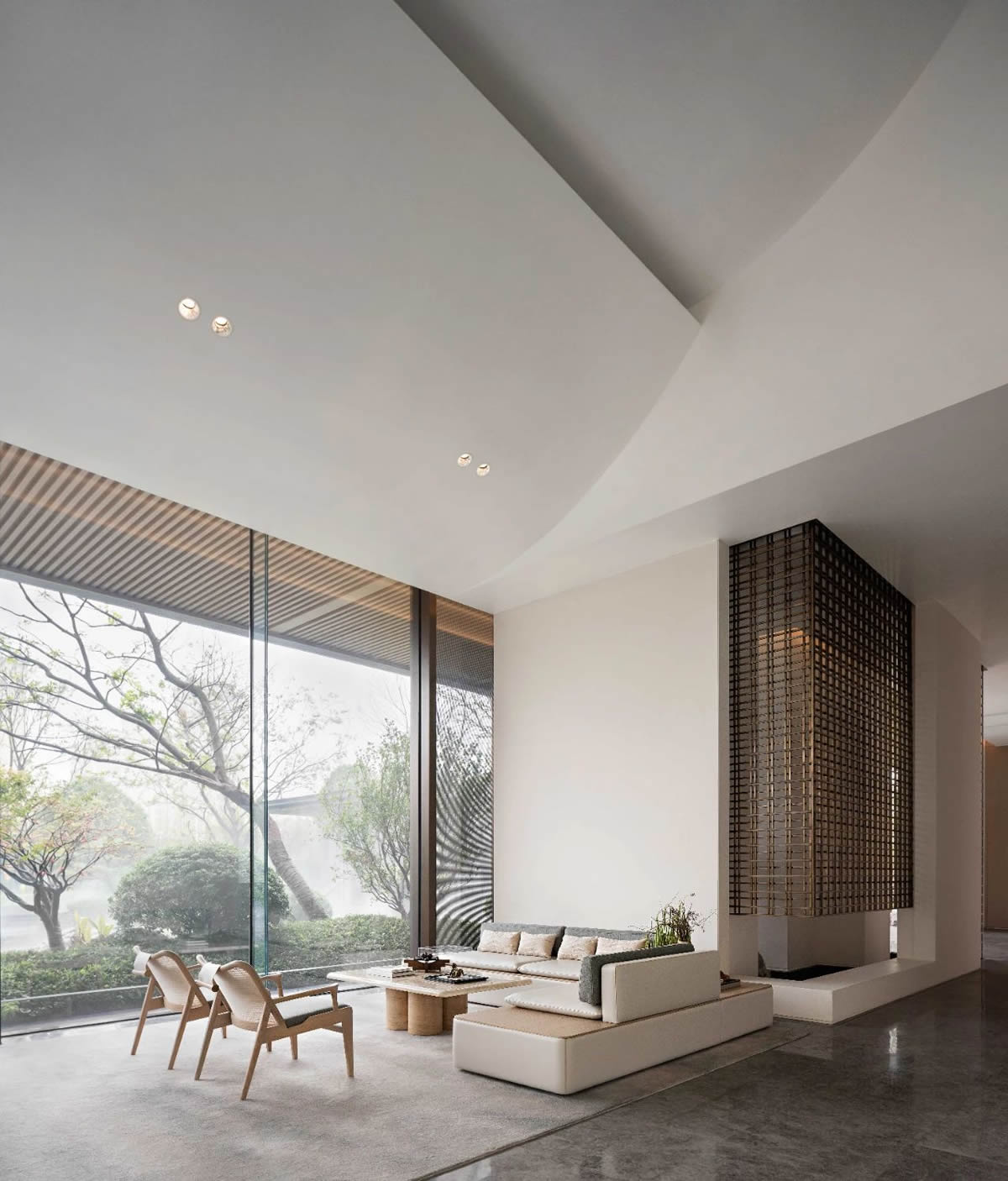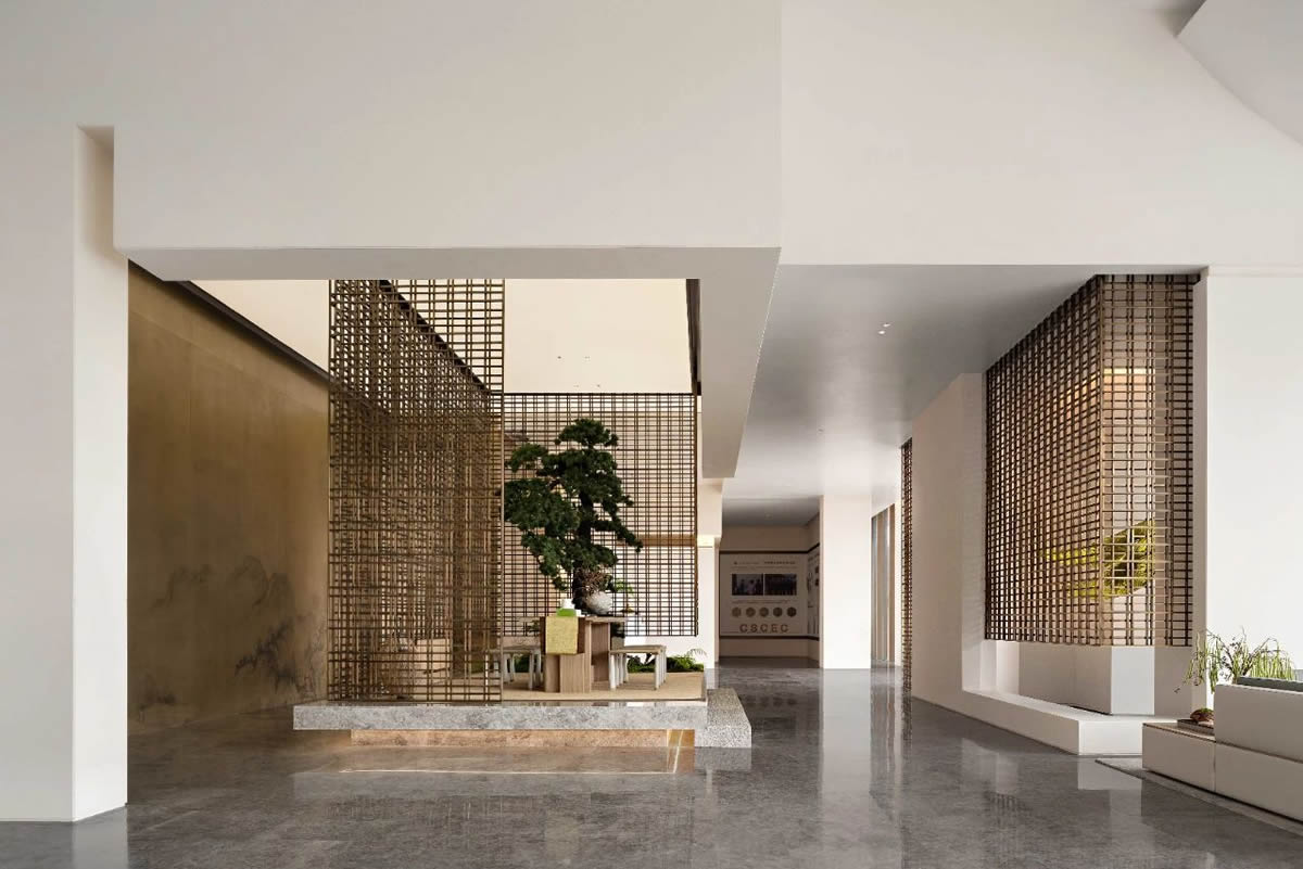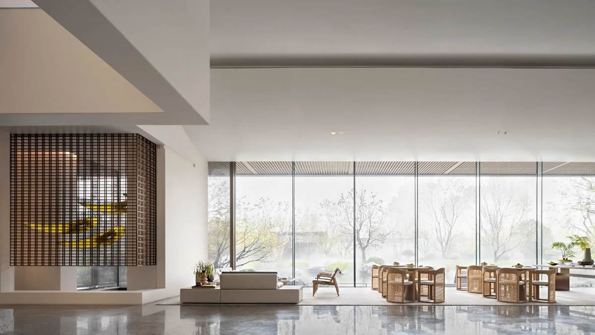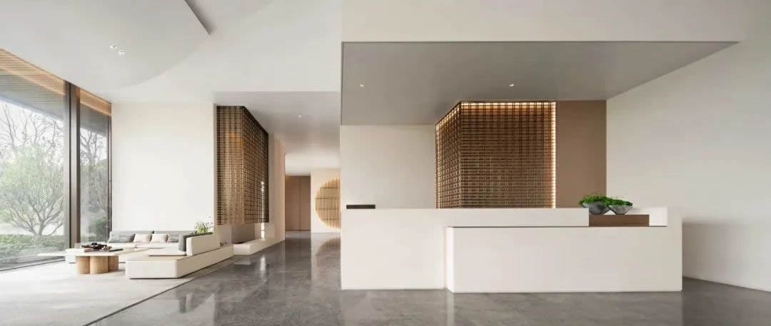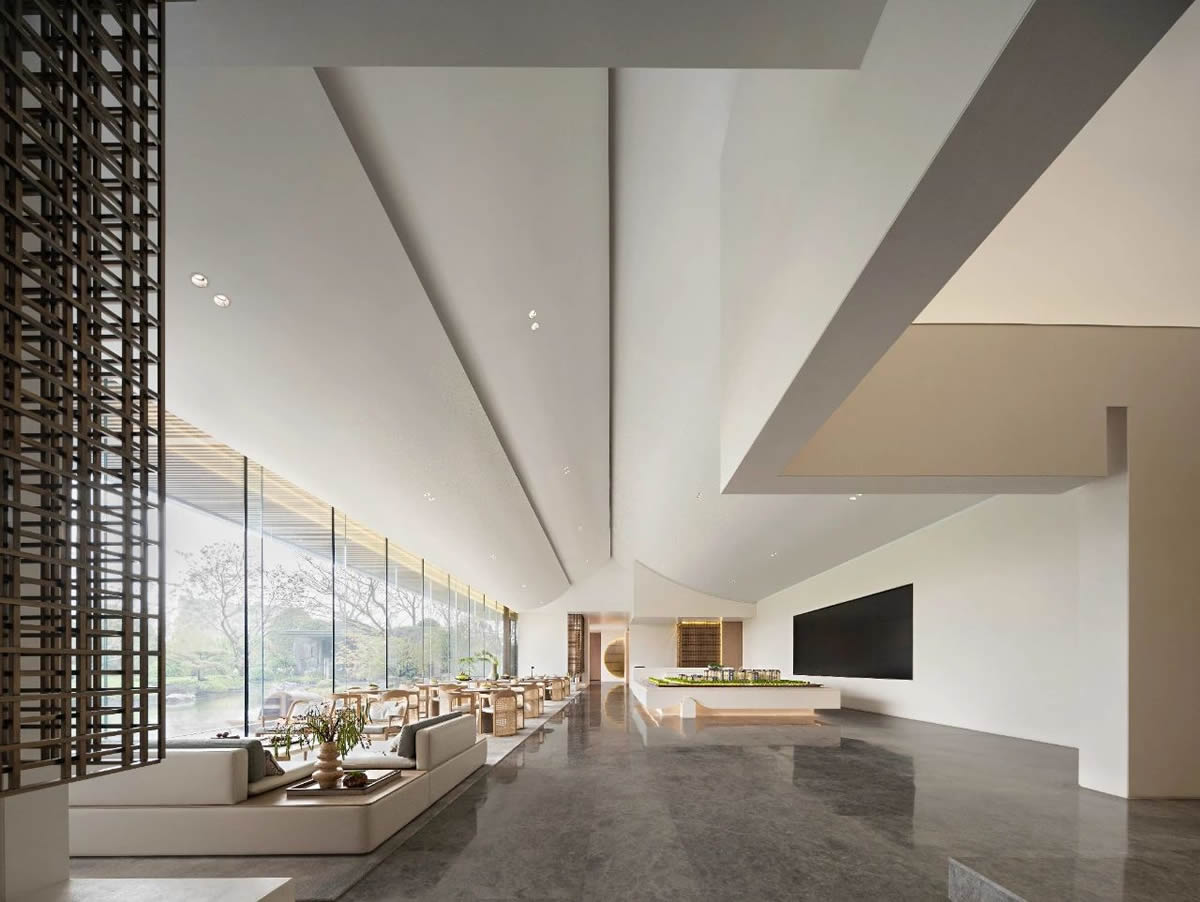 设计师用极简和回归自然的设计语言表达着对大自然的敬畏。并非纯粹只是一个销售点,它更多的是为有意购房的客户营造一个内容丰富、氛围轻松的体验空间。