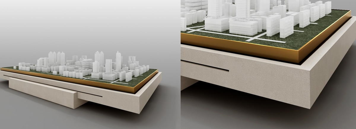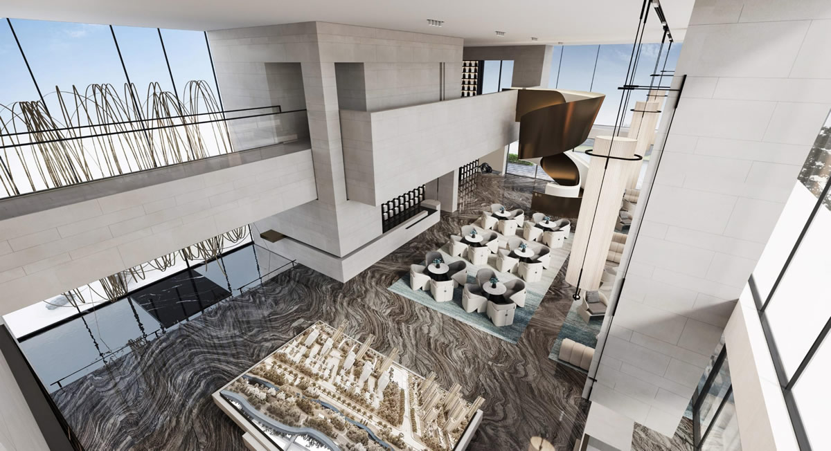 通过现代稳重/简约明快的建筑手法表达出具有国际视野的内建筑形态。远望取其势,近看取其质。江水像微微拂动的丝绸,水天极目处,凝成一种透明的薄雾,水的形态非金非玉。