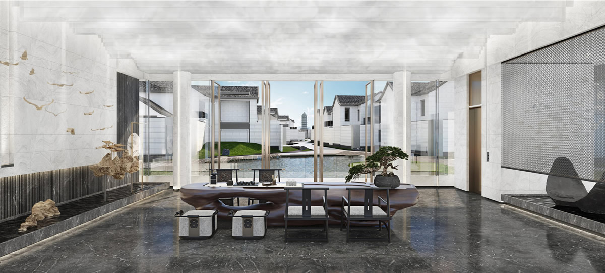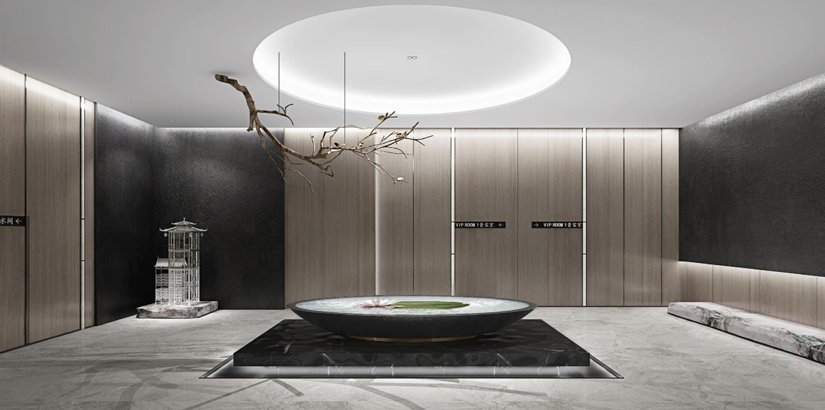 “清风明月本无价,近水远山皆有情”。我們試圖尋求古時”儒雅禅靜“的一種精神狀態。在這一理念下展開設計的,講述了徽州園林宅園合一,可賞,可遊,可居,這種建築形態,人類依戀自然,追求與自然和諧相處,美化和完善自身居住環境的一種創造。围绕主题:靜“賞”、“悅”游、“雅”居。三大方向在設計中尋找自然、環境與人的平衡,匠心獨運地立足於“雅静”,著力于“創新”,用自然元素和文化的演繹,形成了一個藝術與人文兼具的藝術空間。