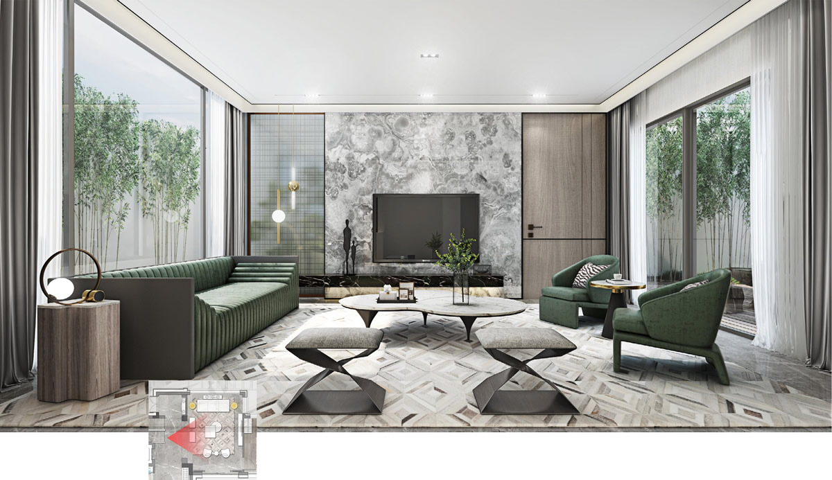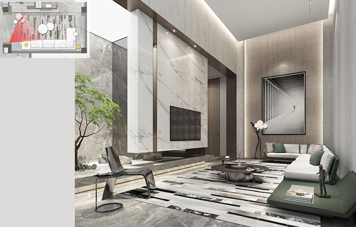 客厅里皮质和布艺组合的高档沙发,彰显主人独特的品味,沙发前,异形的茶几,独特又兼具趣味性,是男主人喜欢的款式。抬眼看前方,一排排竹子仿佛置身竹林,宁静而舒适。女主人拿起茶几上的书,静静的阅读,这是美好的一天,也是他们所向往的美好生活。