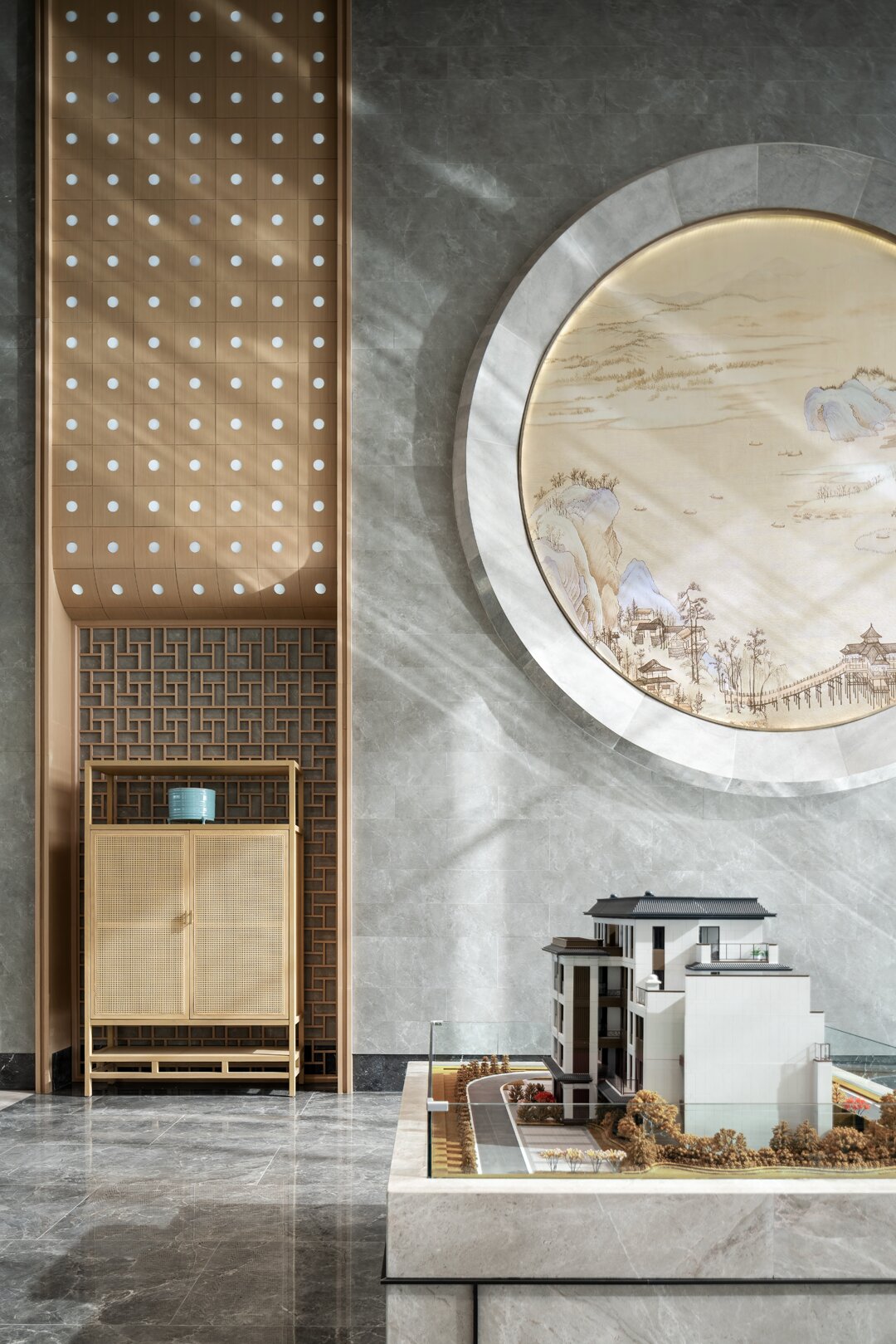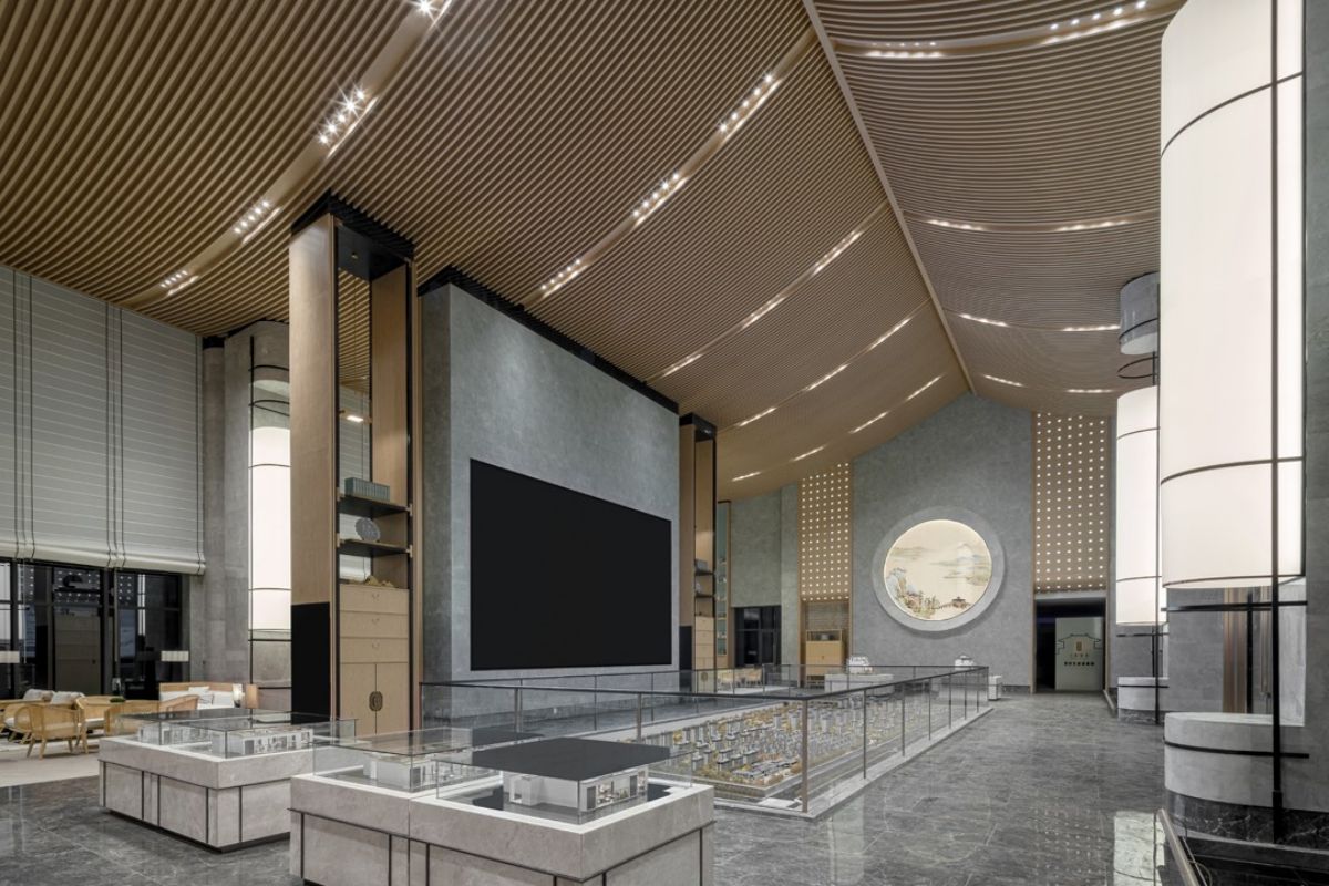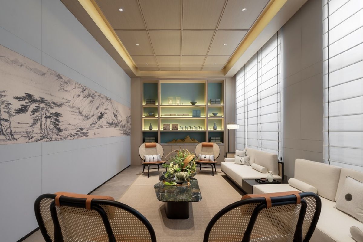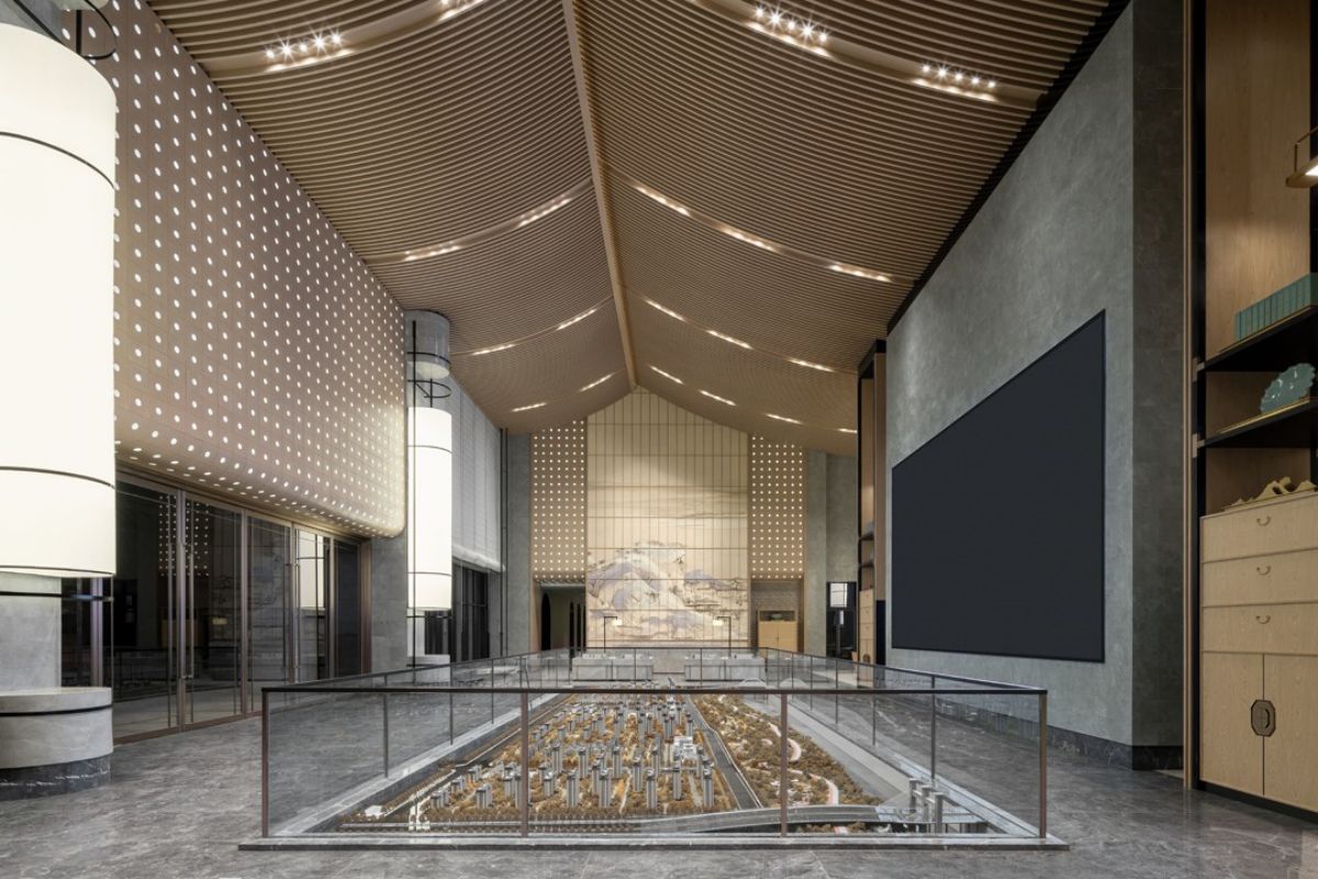 沙盘区域以素雅的木材柔和石材的自然纹理,展现空间简洁精致的同时,结合屏风中式镂空线条及艺术摆置营造出东方的意境之美。
