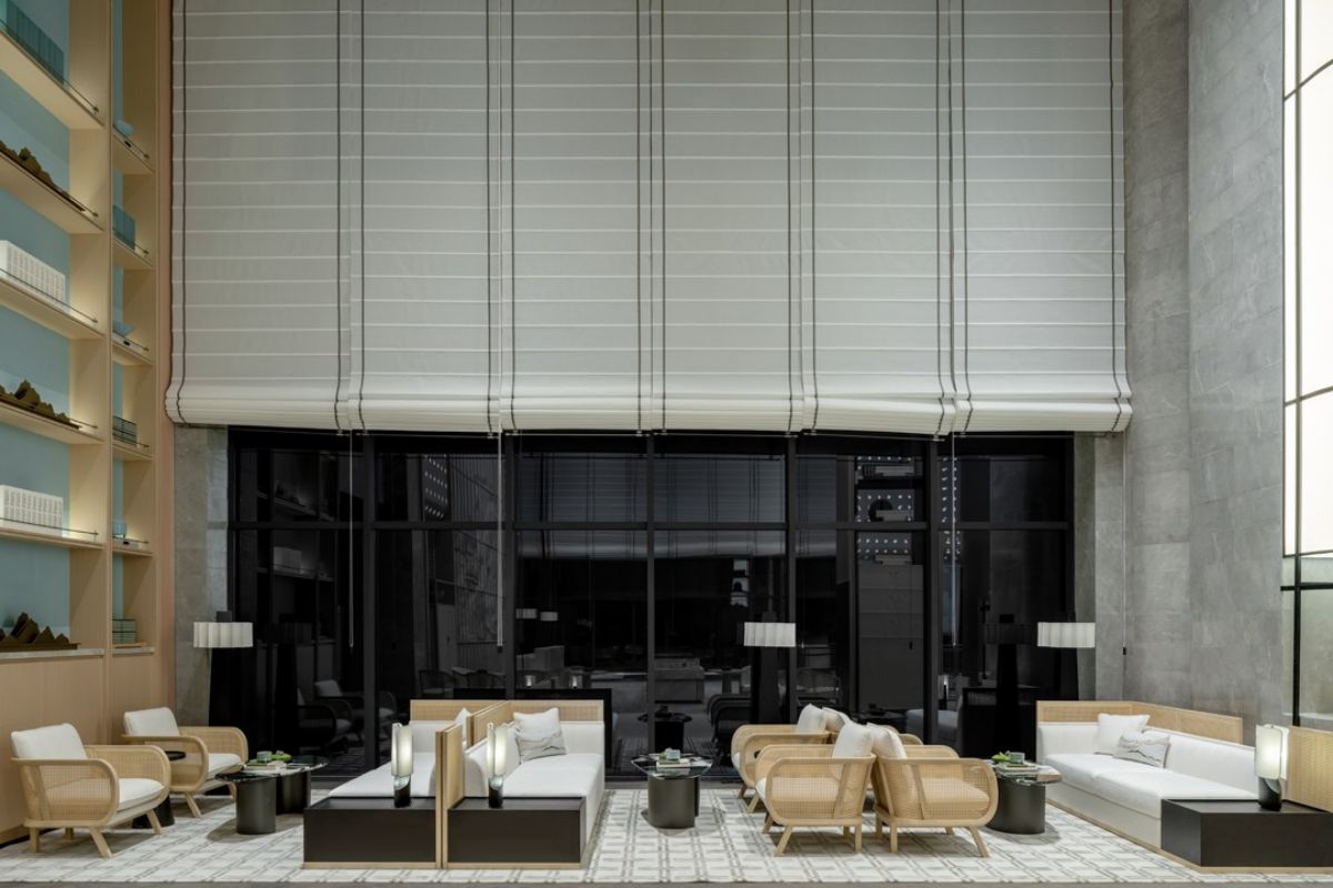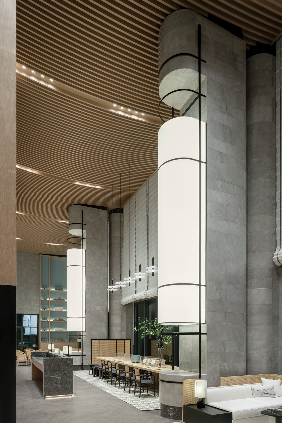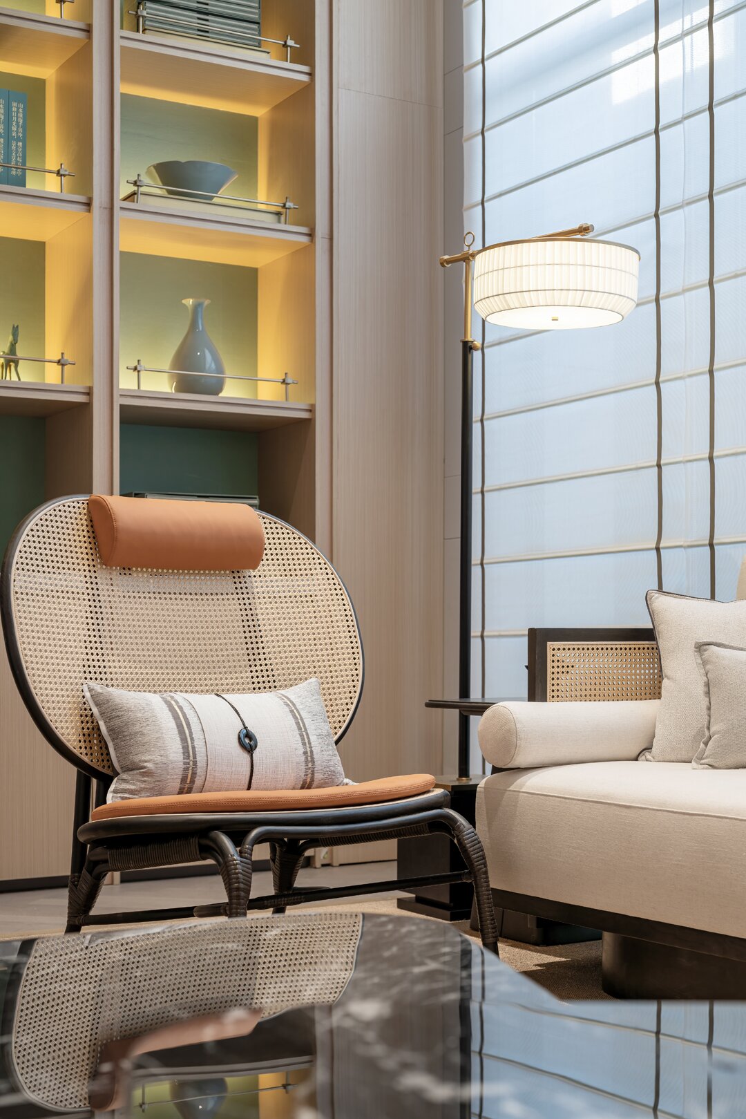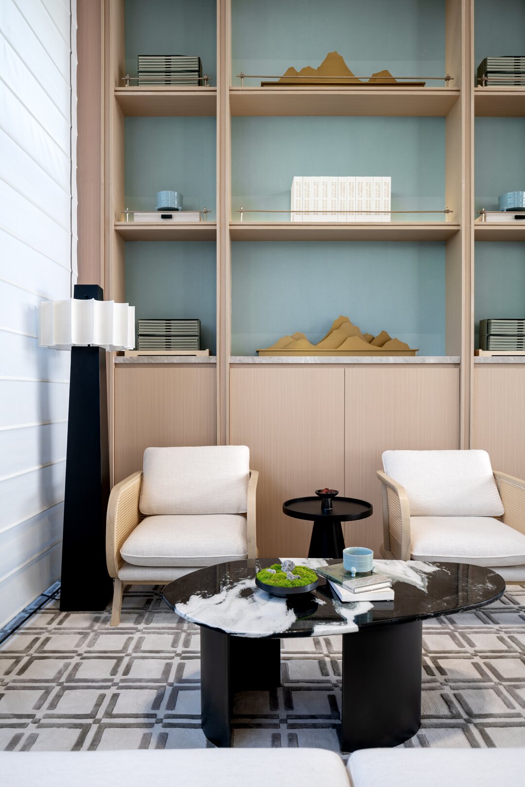 沙盘区域以素雅的木材柔和石材的自然纹理,展现空间简洁精致的同时,结合屏风中式镂空线条及艺术摆置营造出东方的意境之美。