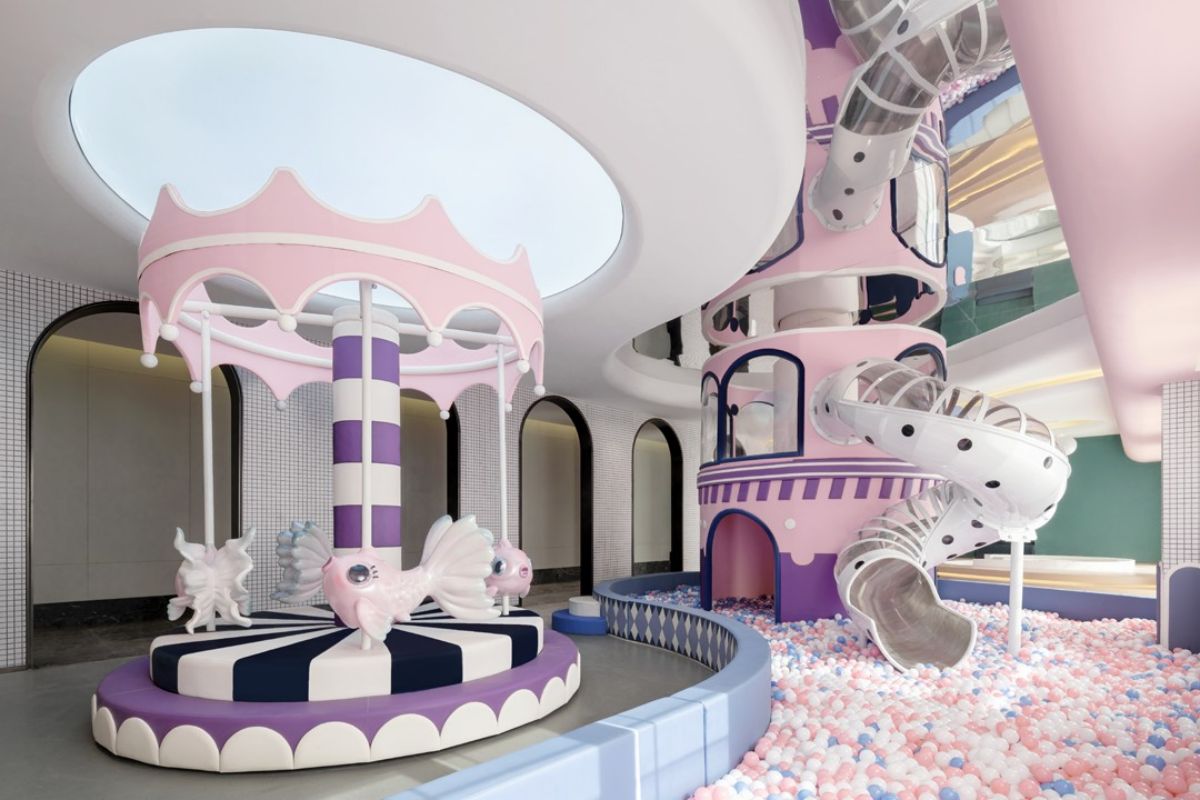 儿童娱乐区占据一角,自然光带来了令所有生命跃动的能量,再添上天空和公主粉的颜色。墙上纯白的马赛克,就连成年人也忍不住去玩上一玩 ,顶面镜面的使用,使一高一矮的两个“小朋友”共同拼凑出美好的艺术。