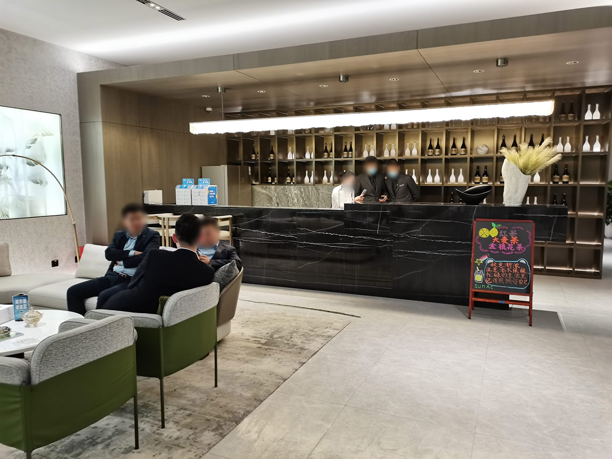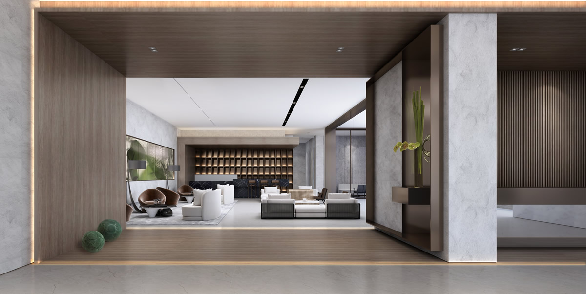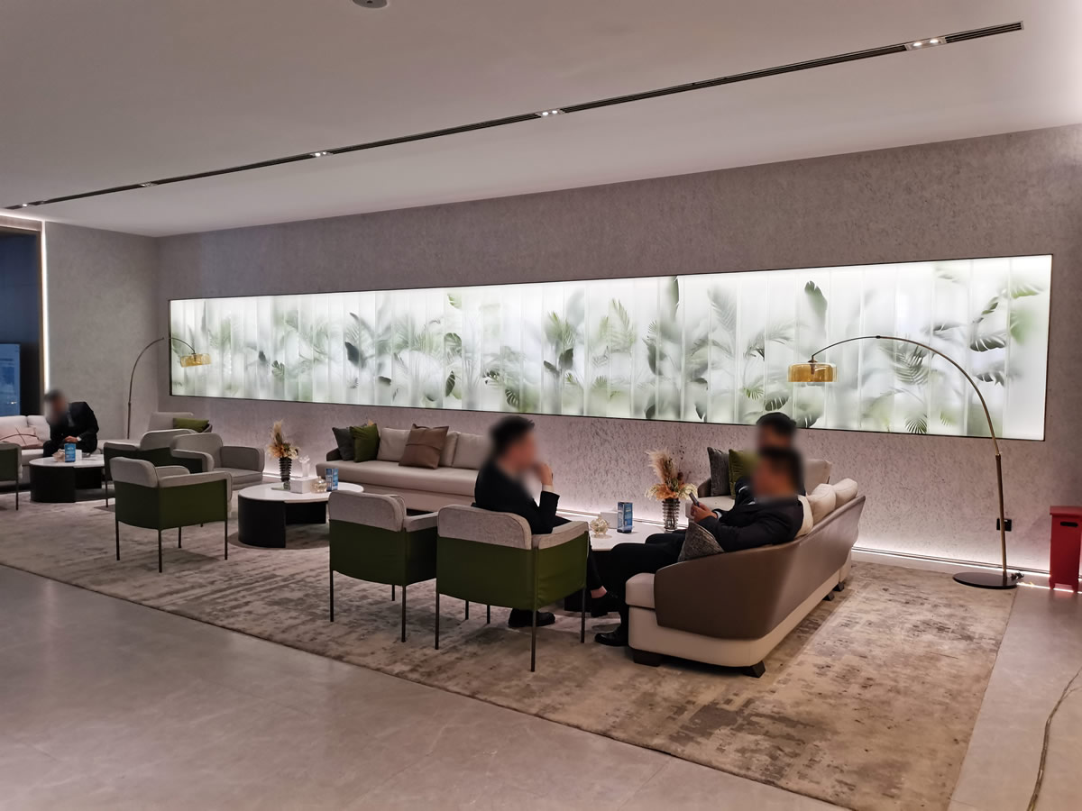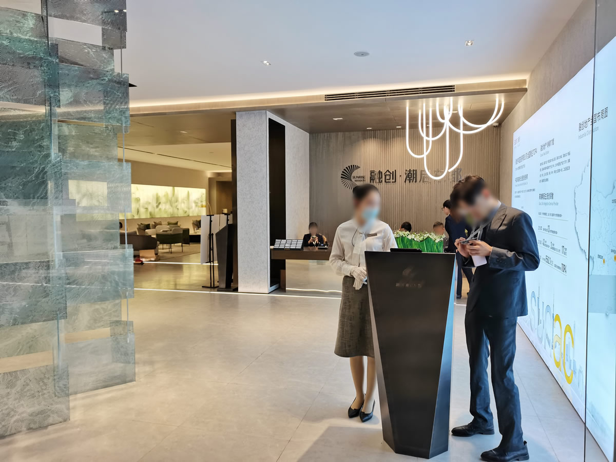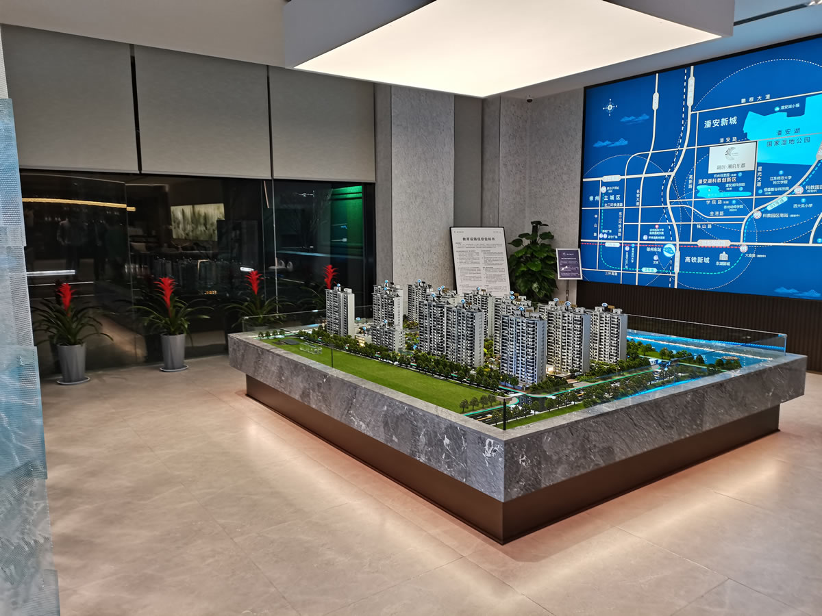 环湖而立,依水而起。水起水落,行云流水。此处为亚克力水波纹屏风,呼应了开发商靠潘安湖景观房的要求,且给人汪洋大海的感觉。