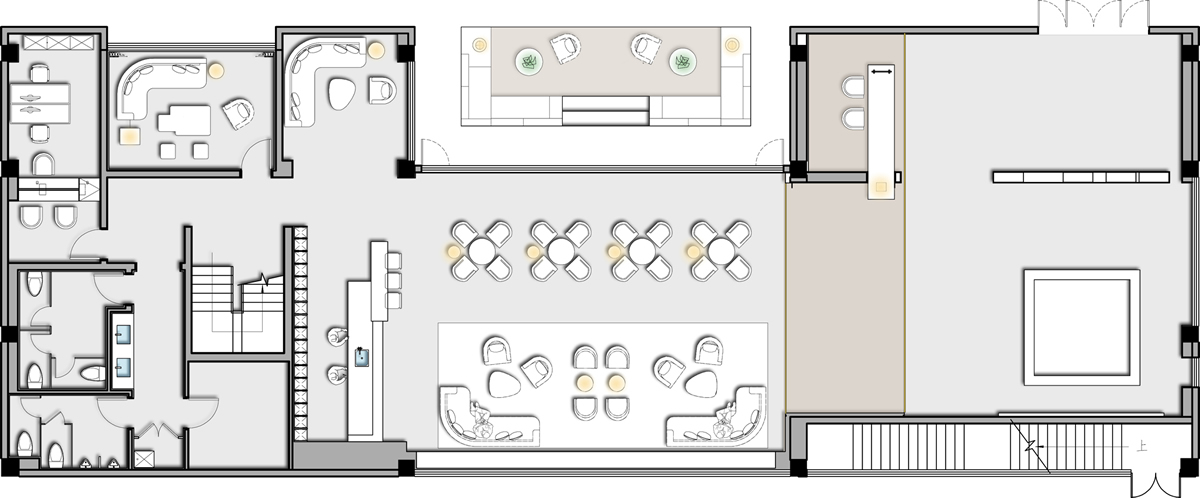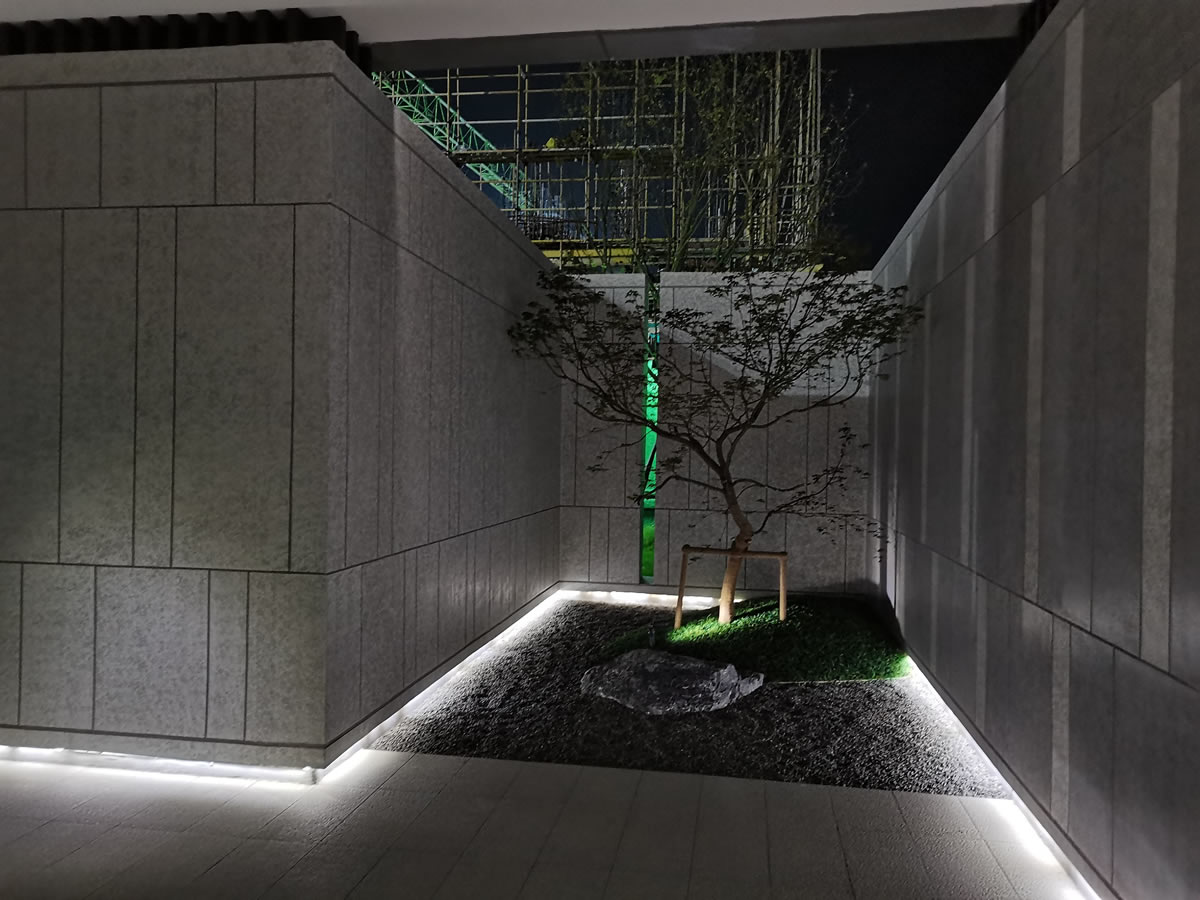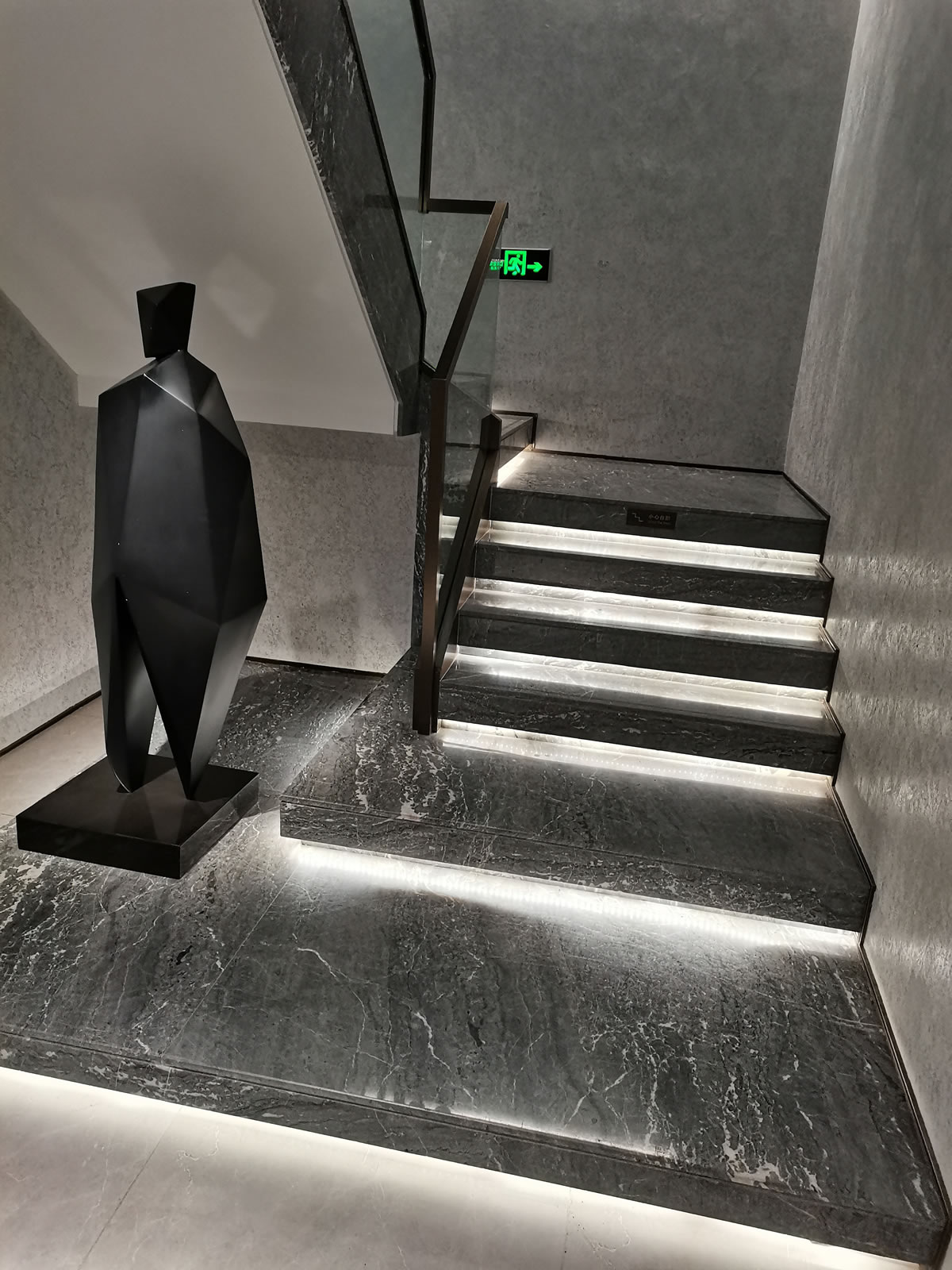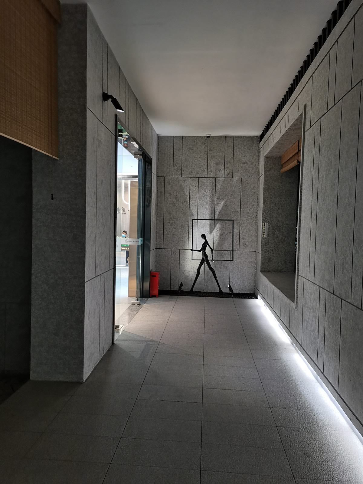 环湖而立,依水而起。水起水落,行云流水。此处为亚克力水波纹屏风,呼应了开发商靠潘安湖景观房的要求,且给人汪洋大海的感觉。