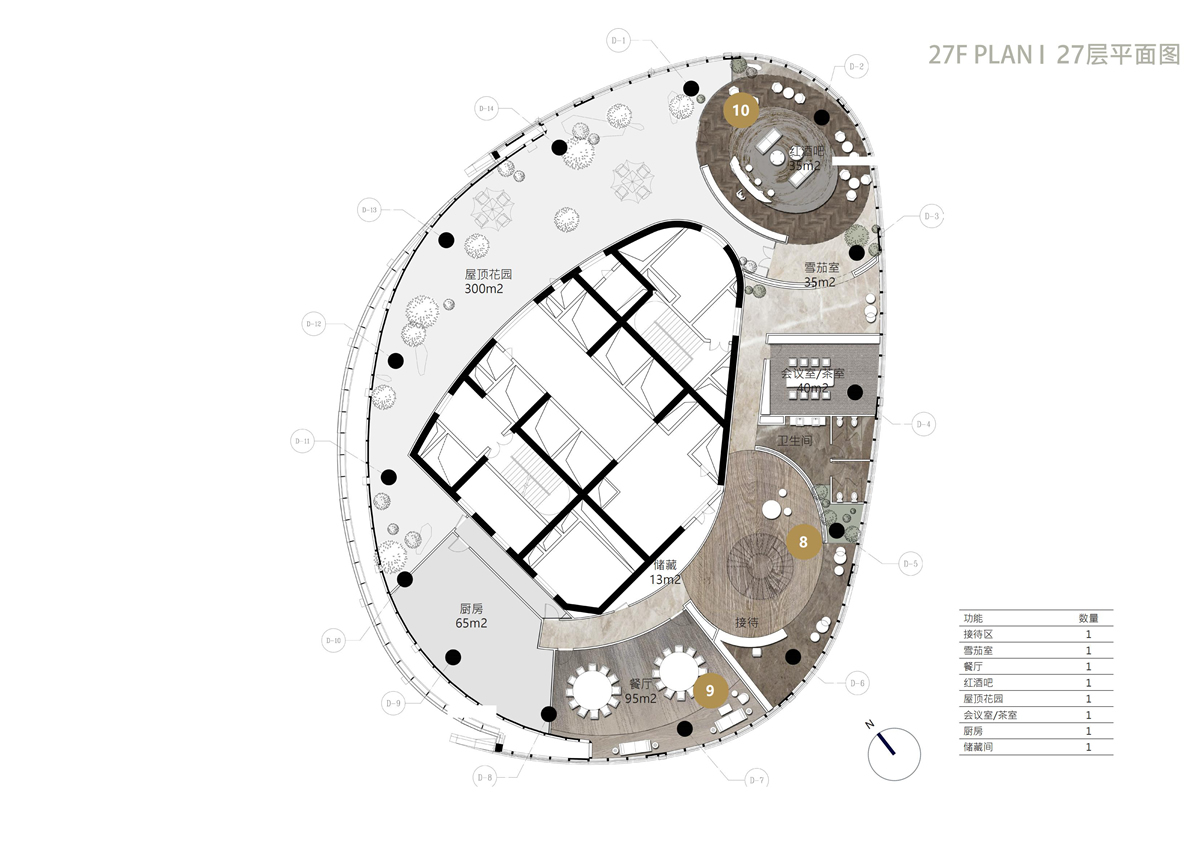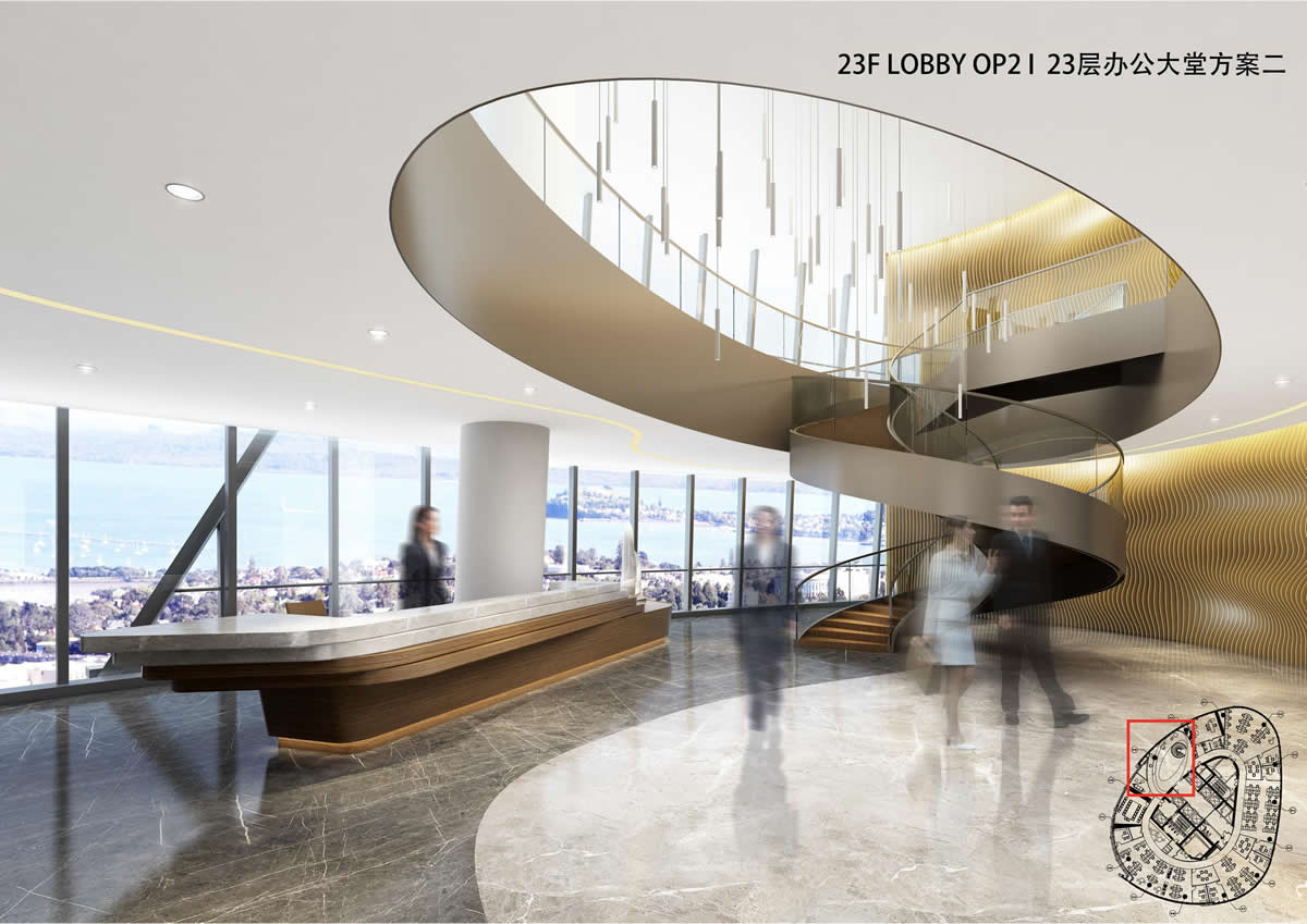 层叠波浪型建筑形体及不规则核心筒设计,使得各楼层的平面尺寸均有差异,平面、布局更具多样性。